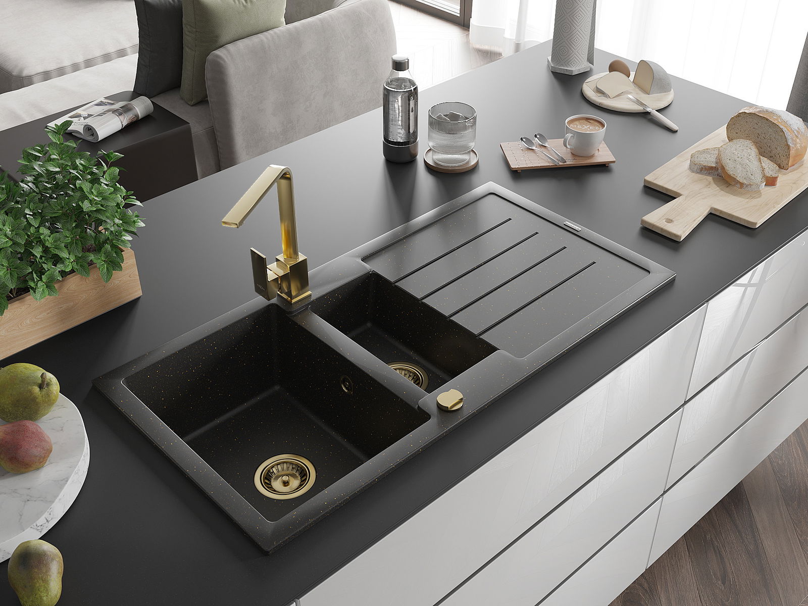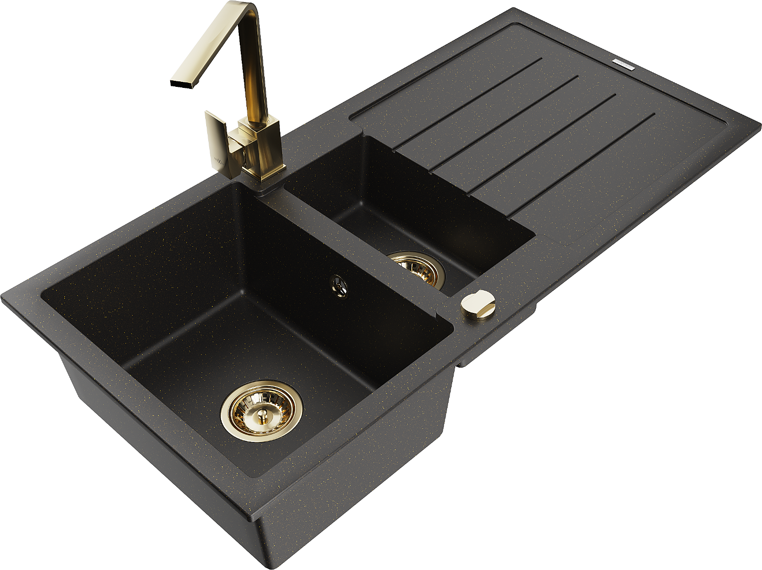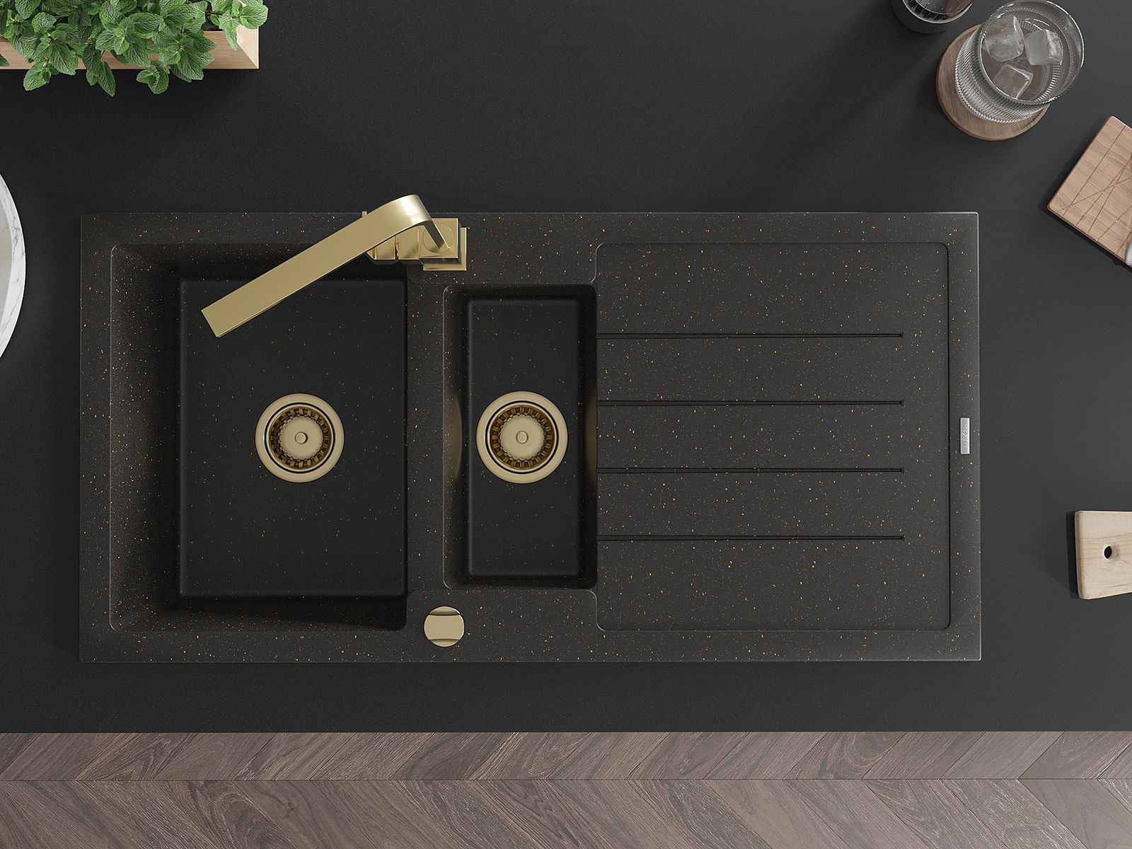 Mexen Andres zlewozmywak granitowy 1,5-komorowy z ociekaczem i baterią kuchenną Rita, czarny/złoty metalik- 6515-75-670300-50