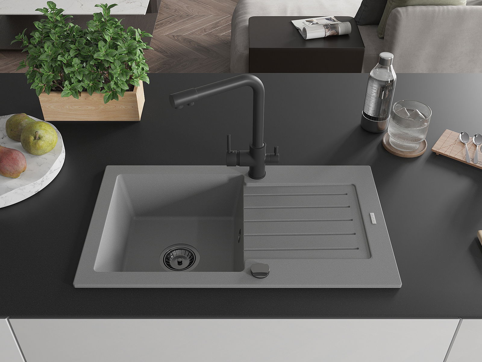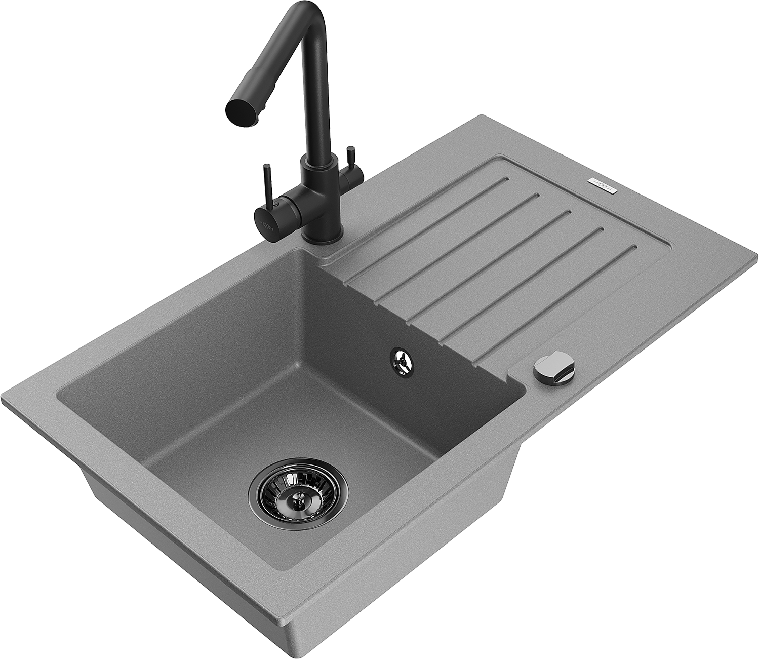 Mexen Pablo zlewozmywak granitowy 1-komorowy z ociekaczem i baterią kuchenną Duero, szary - 6510-71-671600-70-B