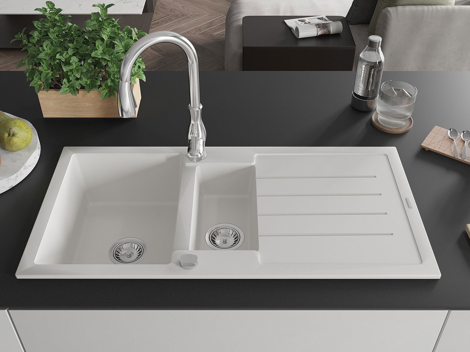 Mexen Andres zlewozmywak granitowy 1,5-komorowy z ociekaczem i baterią kuchenną Savita, biały - 6515-20-672601-00