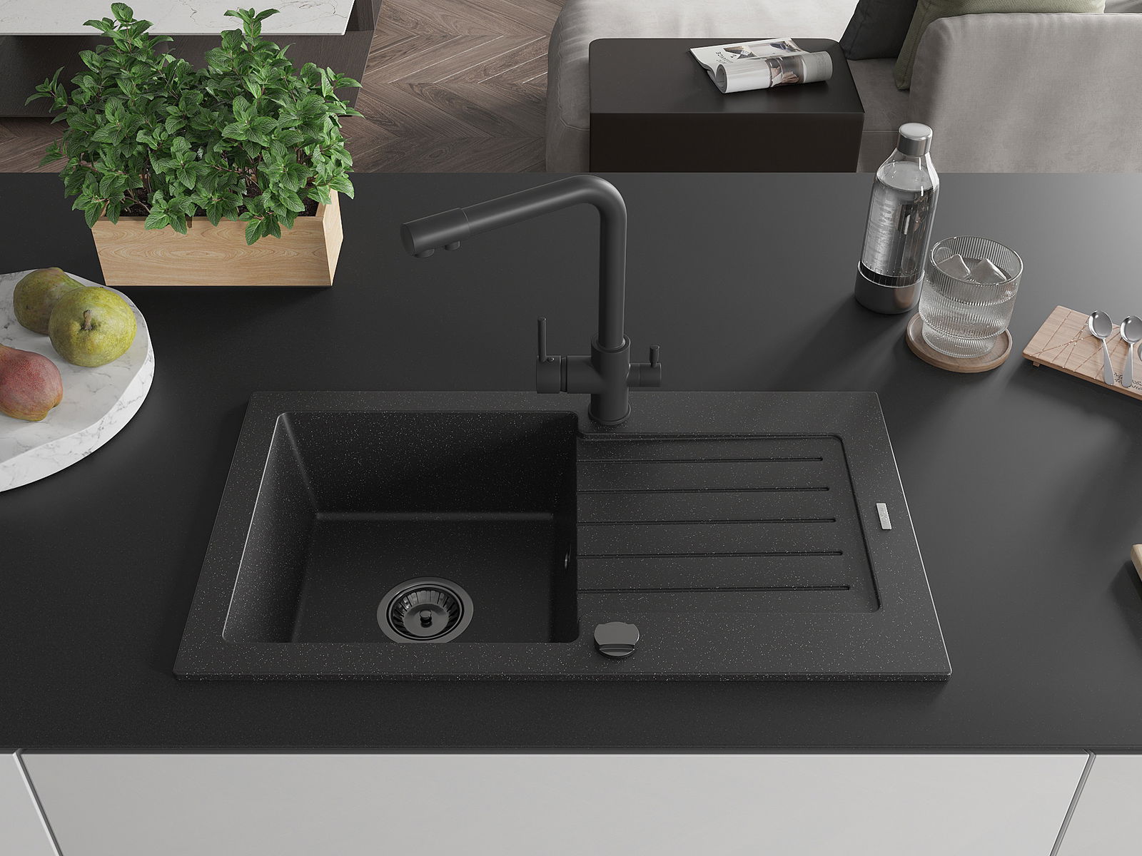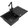 Mexen Pablo zlewozmywak granitowy 1-komorowy z ociekaczem i baterią kuchenną Duero, czarny/srebrny metalik - 6510-73-671600-70-B