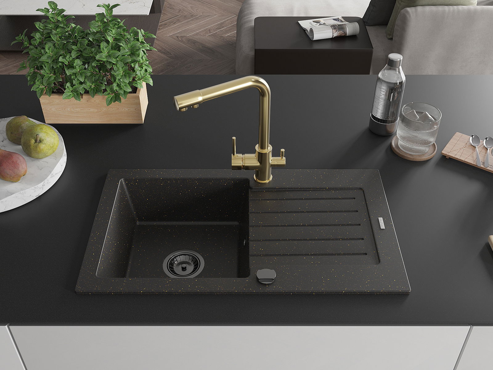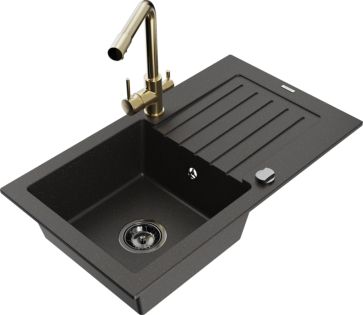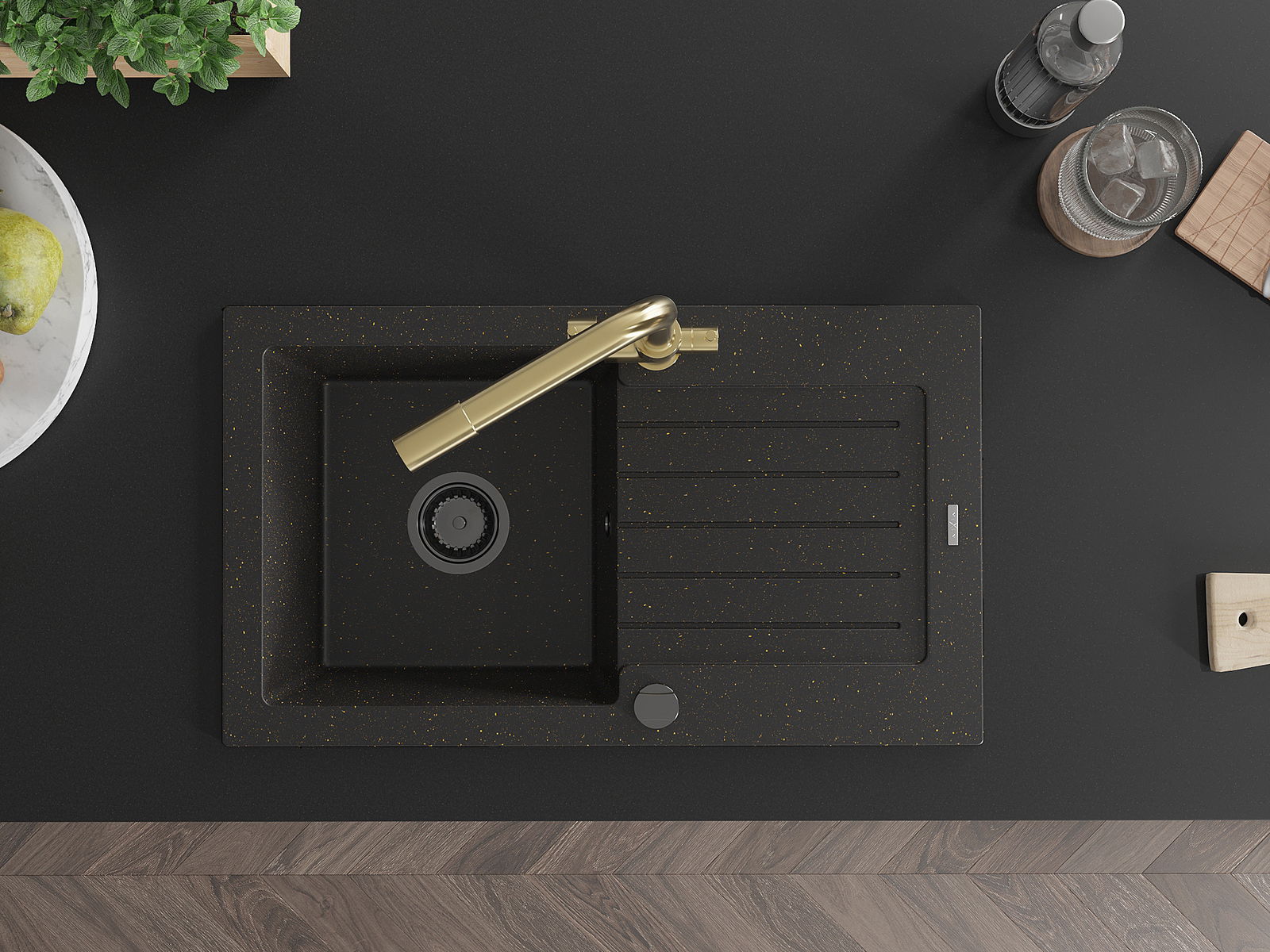 Mexen Pablo zlewozmywak granitowy 1-komorowy z ociekaczem i baterią kuchenną Duero, czarny/złoty metalik - 6510-75-671600-50-B