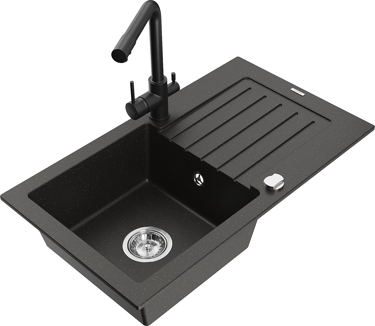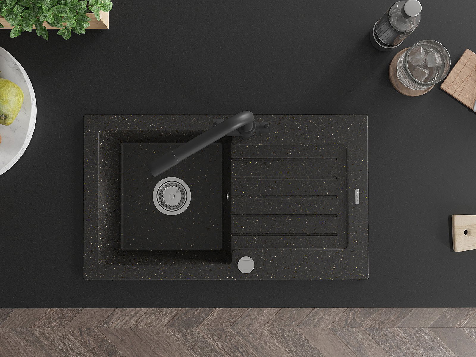 Mexen Pablo zlewozmywak granitowy 1-komorowy z ociekaczem i baterią kuchenną Duero, czarny/złoty metalik - 6510-75-671600-70