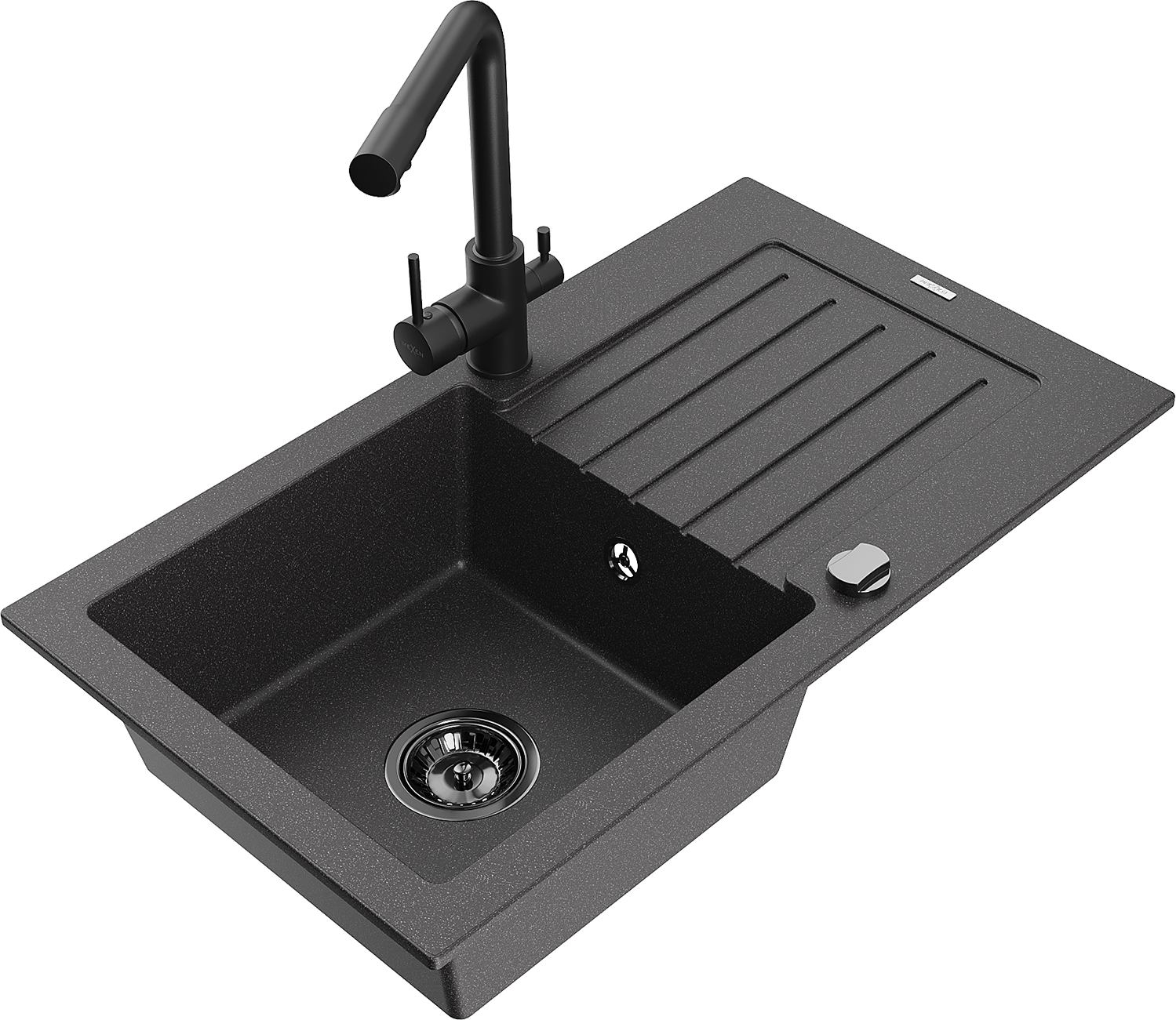 Mexen Pablo zlewozmywak granitowy 1-komorowy z ociekaczem i baterią kuchenną Duero, czarny nakrapiany - 6510-76-671600-70-B