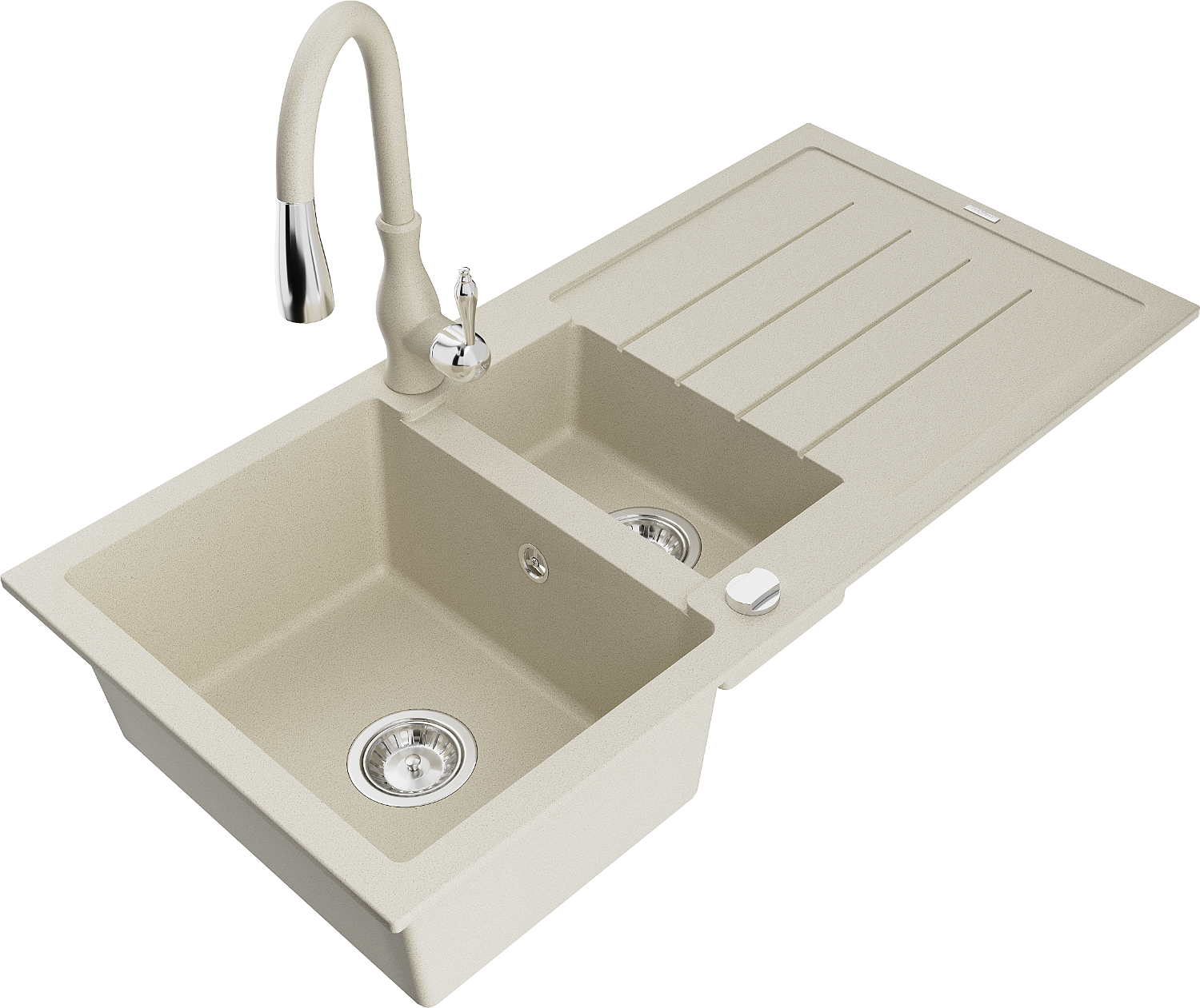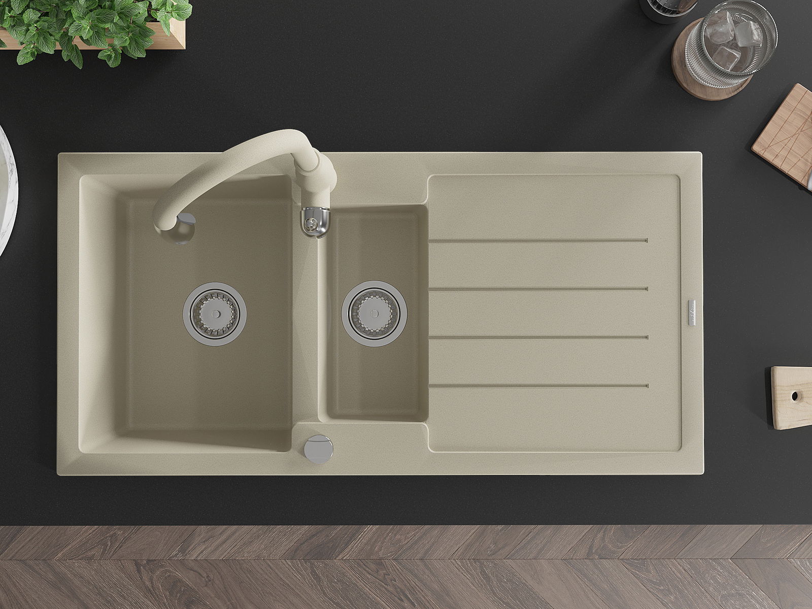 Mexen Andres zlewozmywak granitowy 1,5-komorowy z ociekaczem i baterią kuchenną Savita, beżowy - 6515-69-672601-69