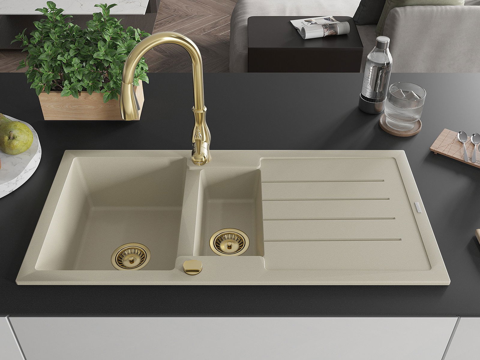 Mexen Andres zlewozmywak granitowy 1,5-komorowy z ociekaczem i baterią kuchenną Savita, beżowy - 6515-69-672601-50