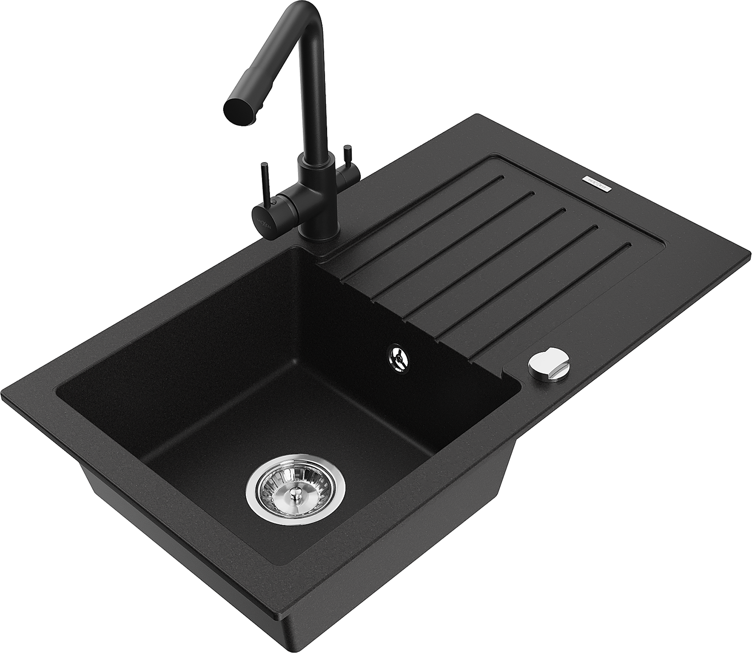Mexen Pablo zlewozmywak granitowy 1-komorowy z ociekaczem i baterią kuchenną Duero, czarny - 6510-77-671600-70