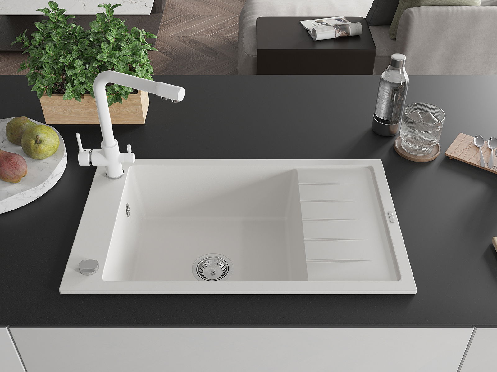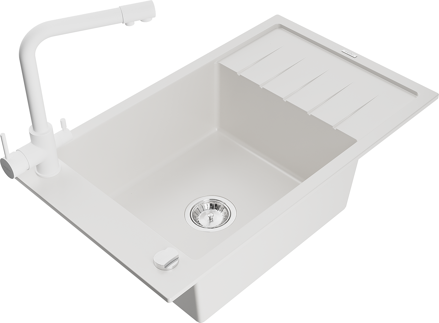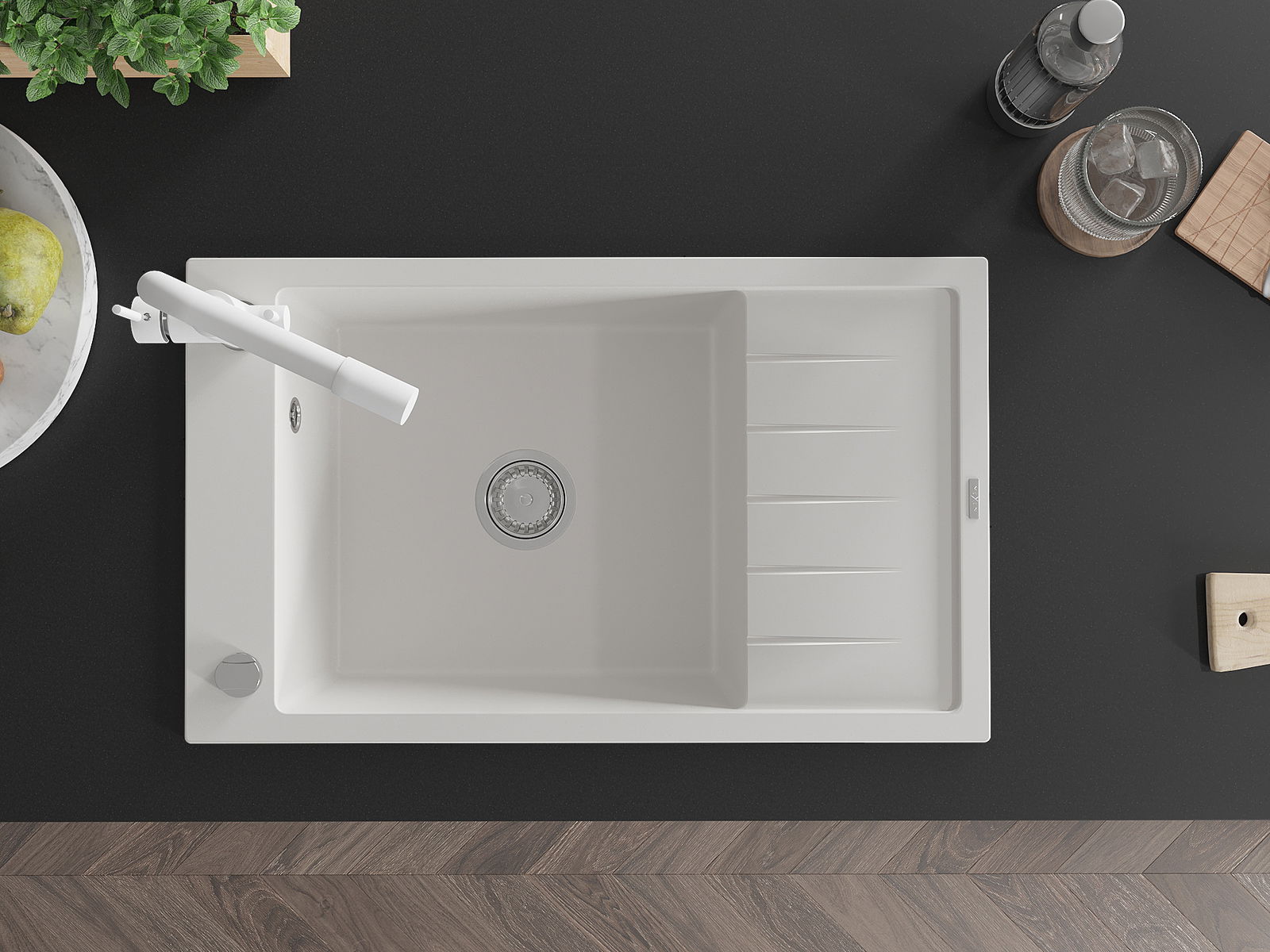 Mexen Elias zlewozmywak granitowy 1-komorowy z ociekaczem i baterią kuchenną Duero, biały - 6511-20-671600-20