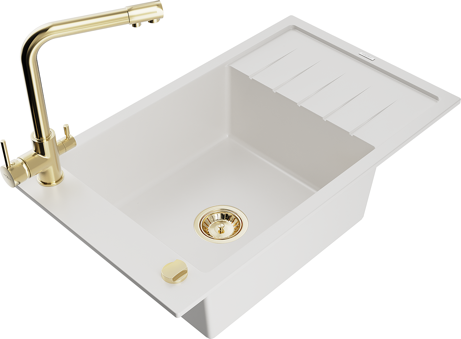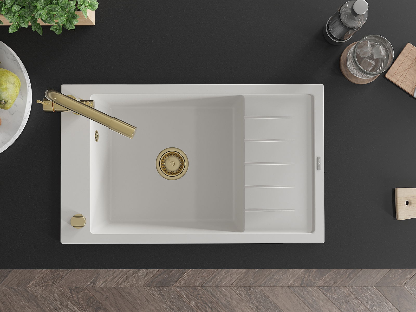Mexen Elias zlewozmywak granitowy 1-komorowy z ociekaczem i baterią kuchenną Duero, biały - 6511-20-671600-50