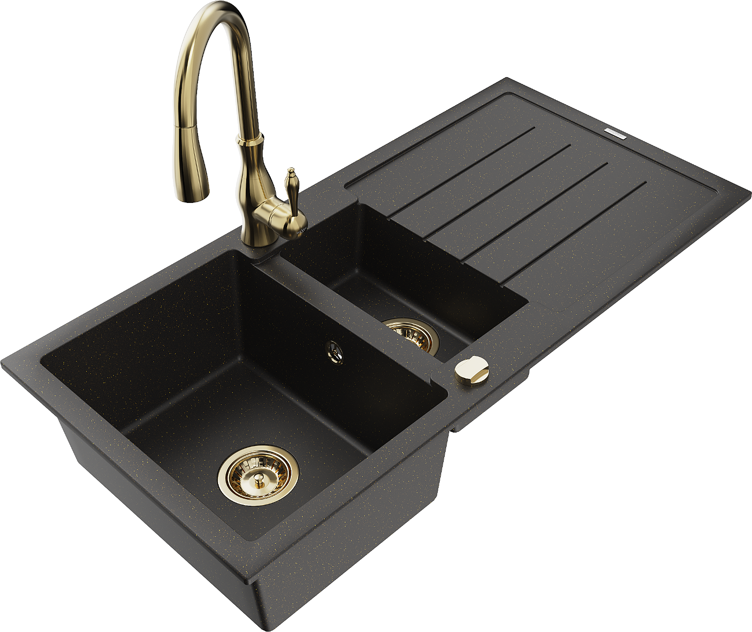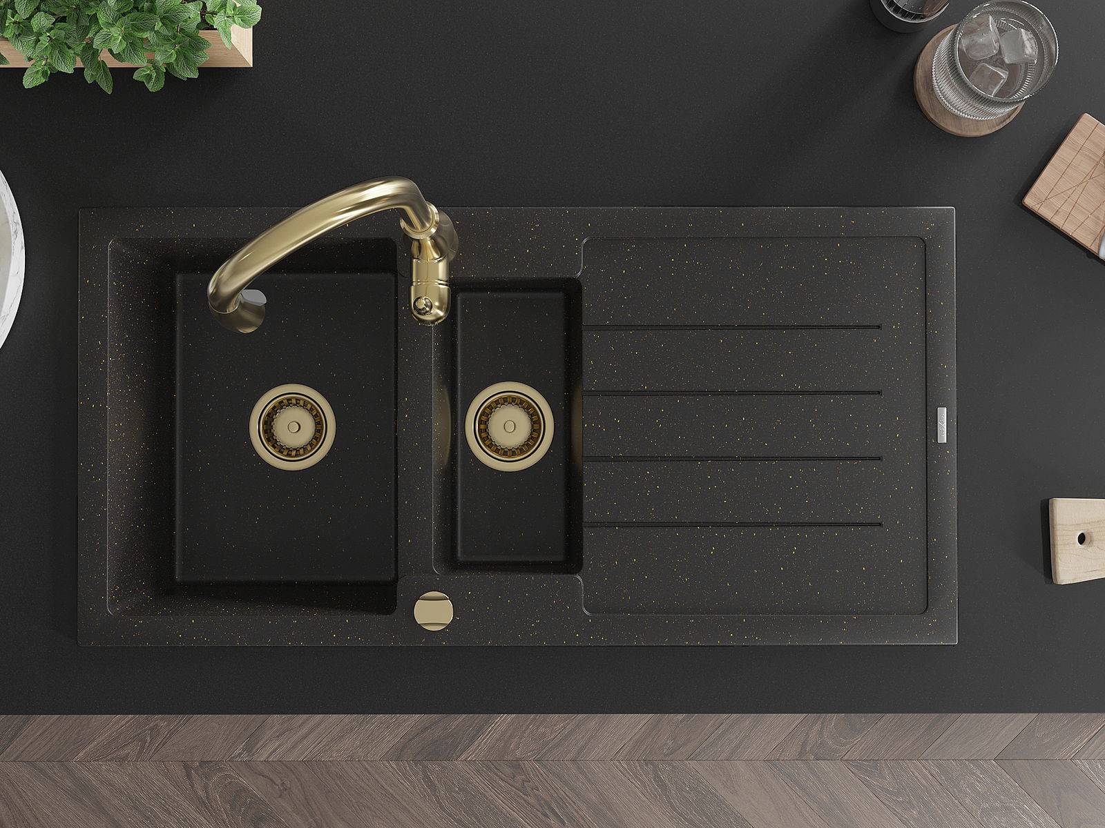 Mexen Andres zlewozmywak granitowy 1,5-komorowy z ociekaczem i baterią kuchenną Savita, czarny/złoty metalik- 6515-75-672601-50