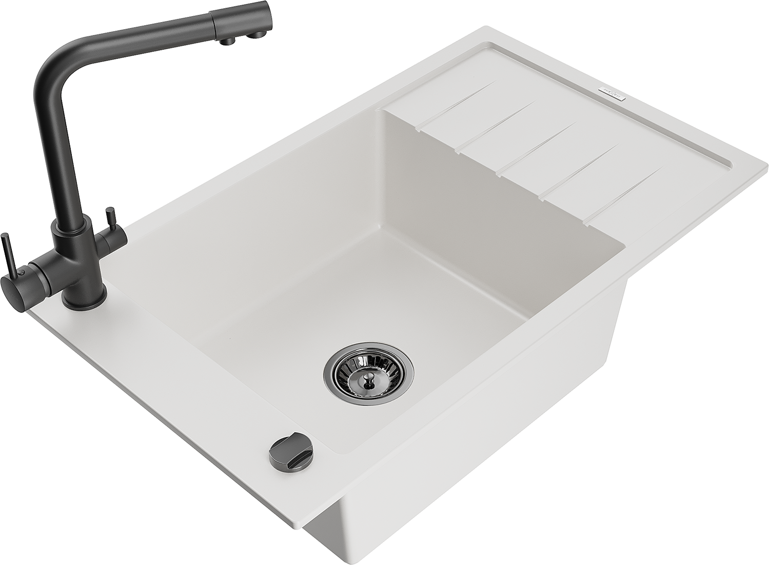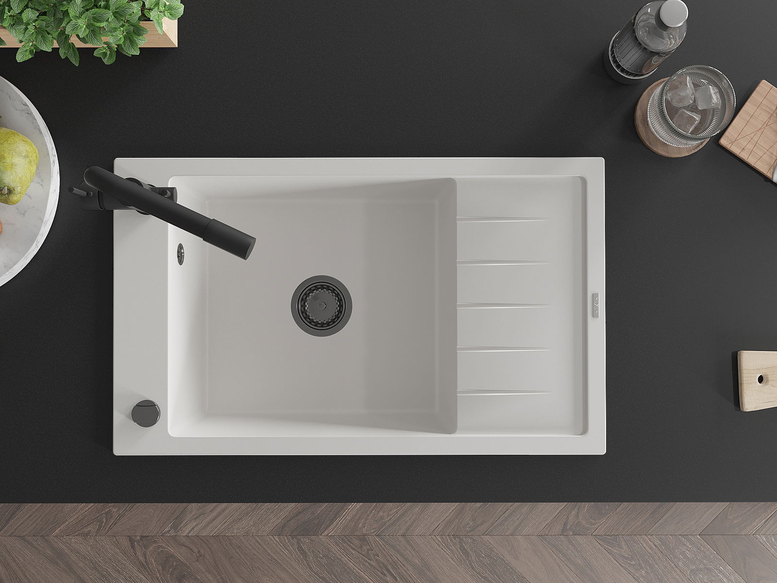 Mexen Elias zlewozmywak granitowy 1-komorowy z ociekaczem i baterią kuchenną Duero, biały - 6511-20-671600-70