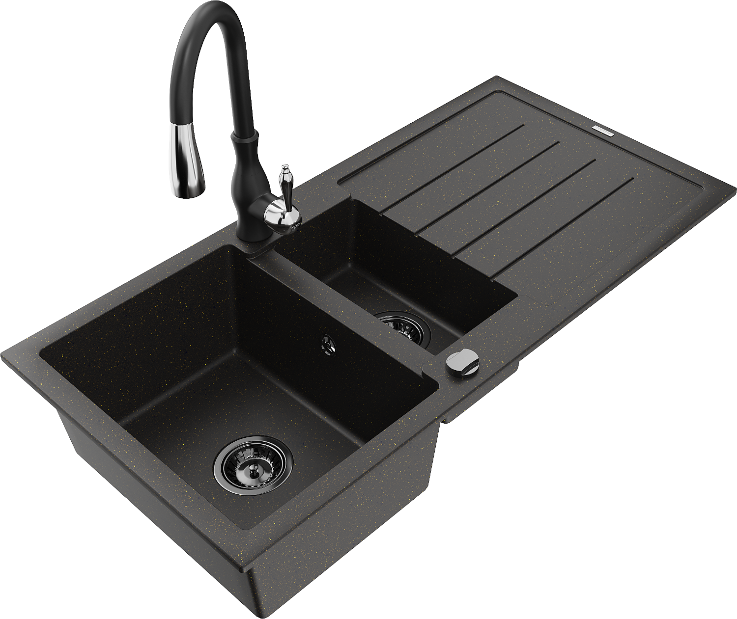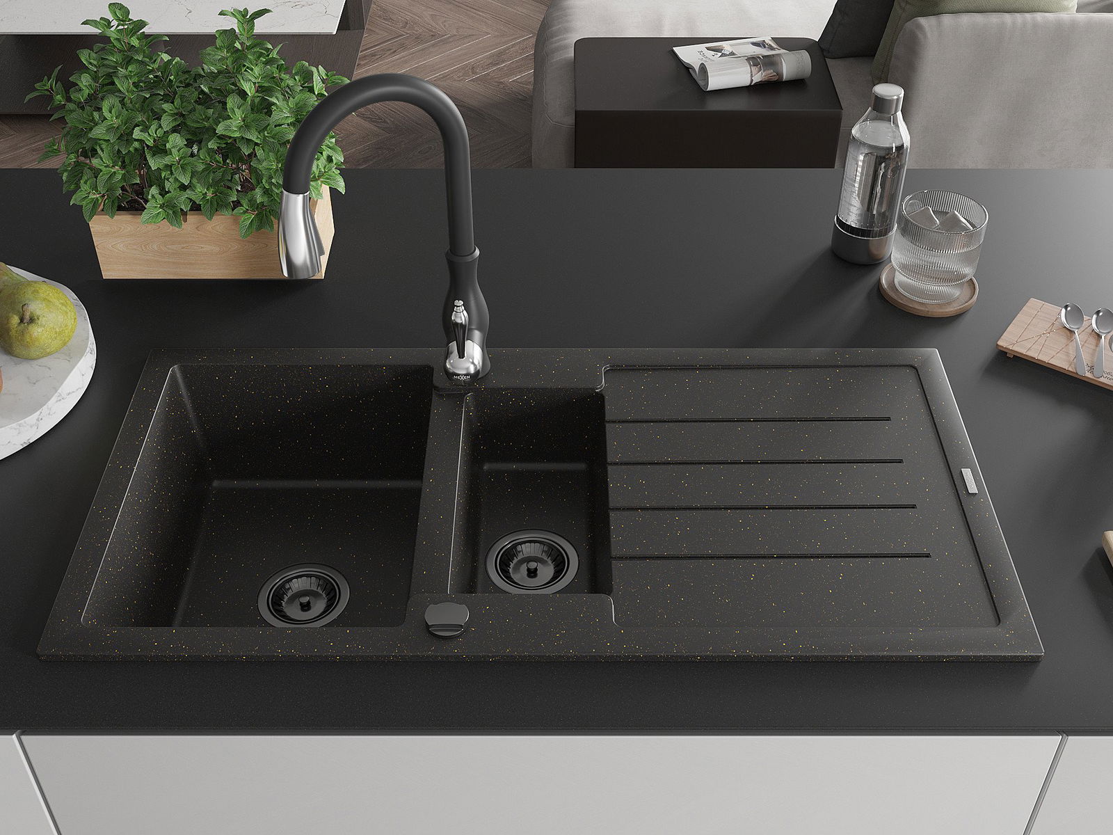 Mexen Andres zlewozmywak granitowy 1,5-komorowy z ociekaczem i baterią kuchenną Savita, czarny/złoty - 6515-75-672601-70-B