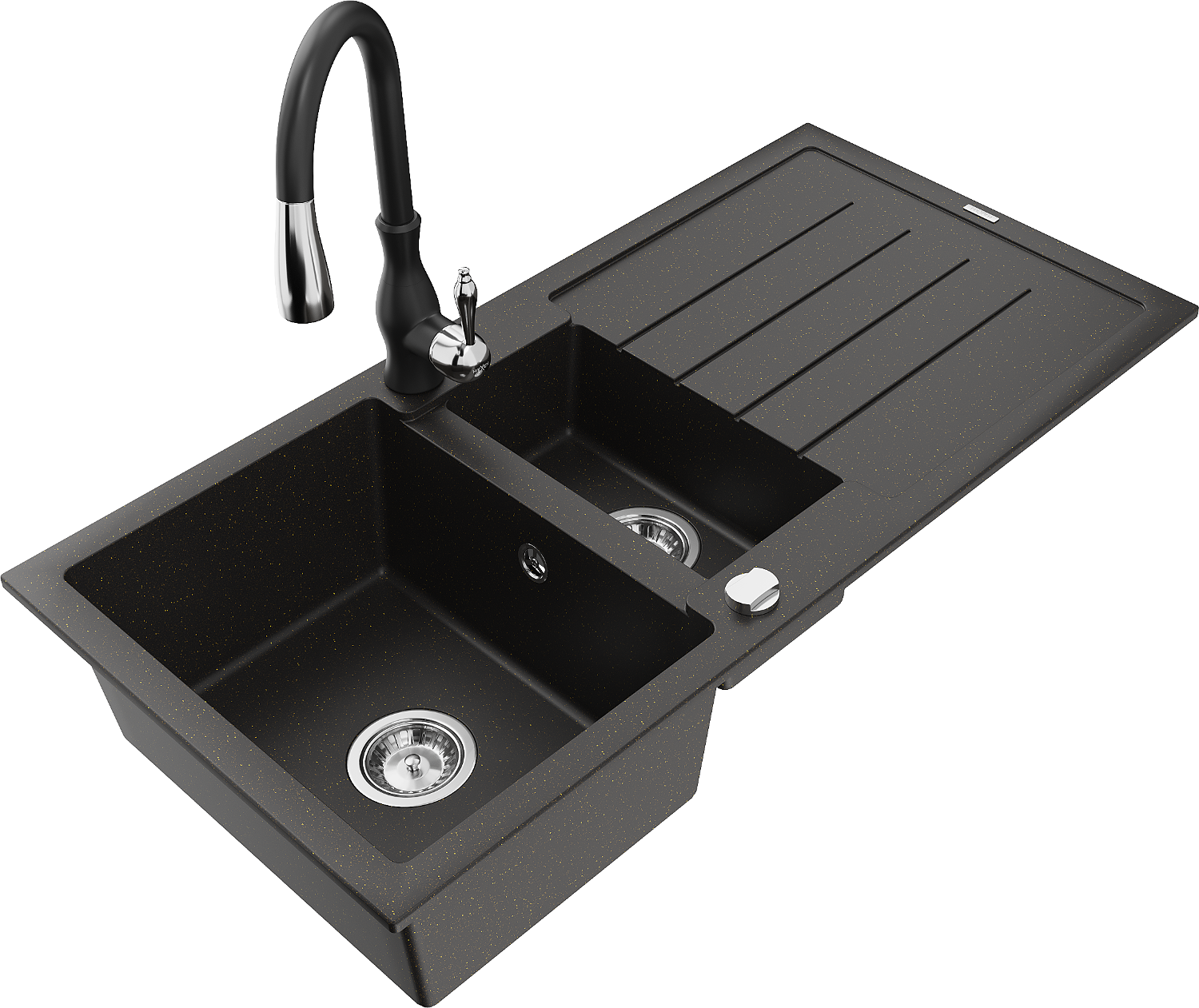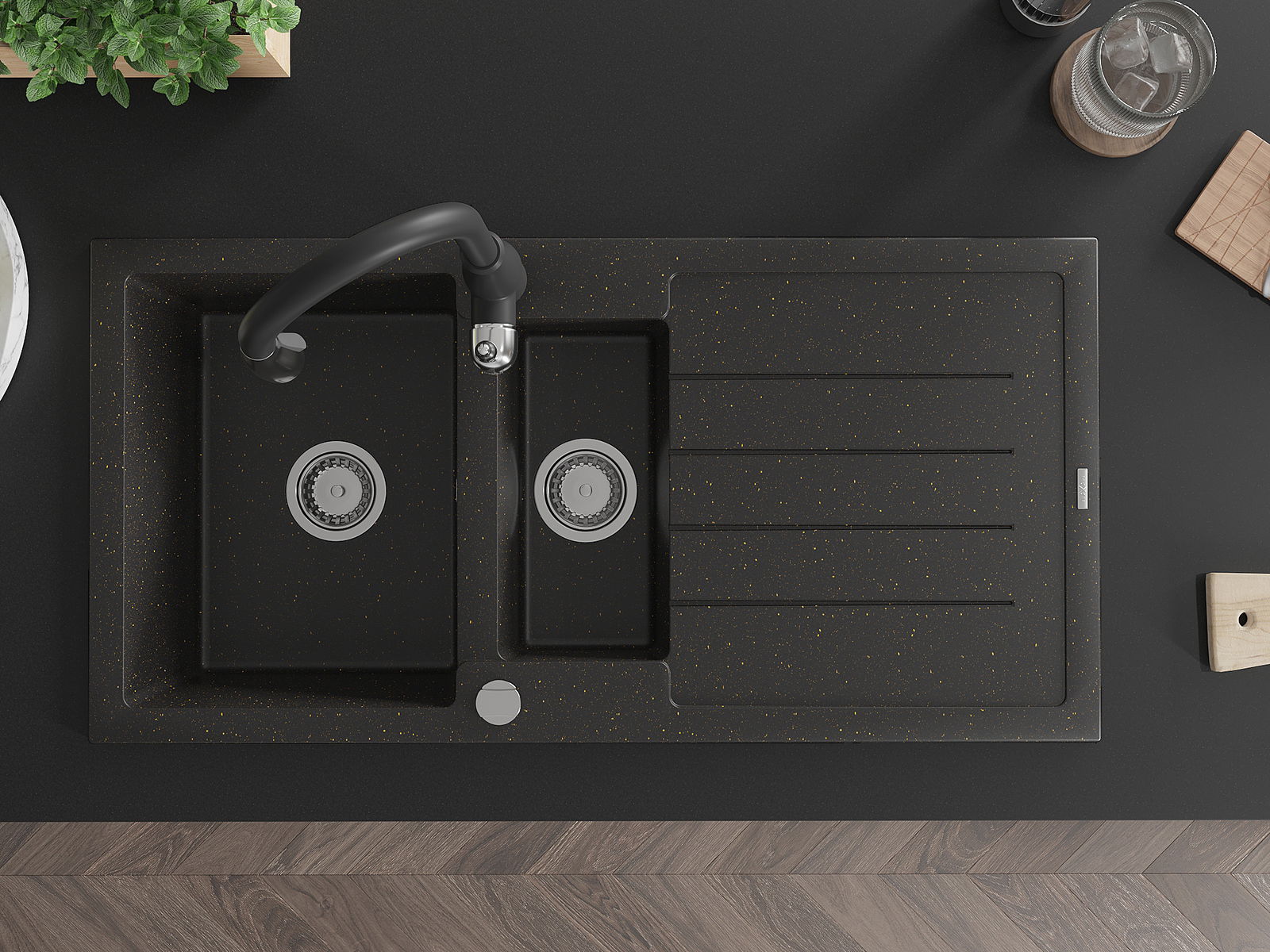 Mexen Andres zlewozmywak granitowy 1,5-komorowy z ociekaczem i baterią kuchenną Savita, czarny/złoty metalik - 6515-75-672601-70