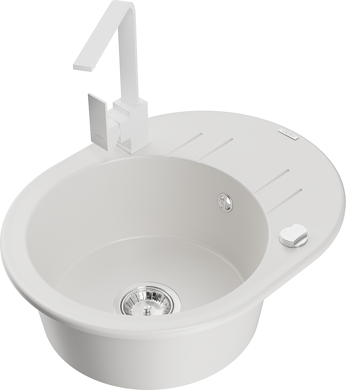 Mexen Kevin zlewozmywak granitowy 1-komorowy z ociekaczem i baterią kuchenną Rita, biały - 6517-20-670300-20
