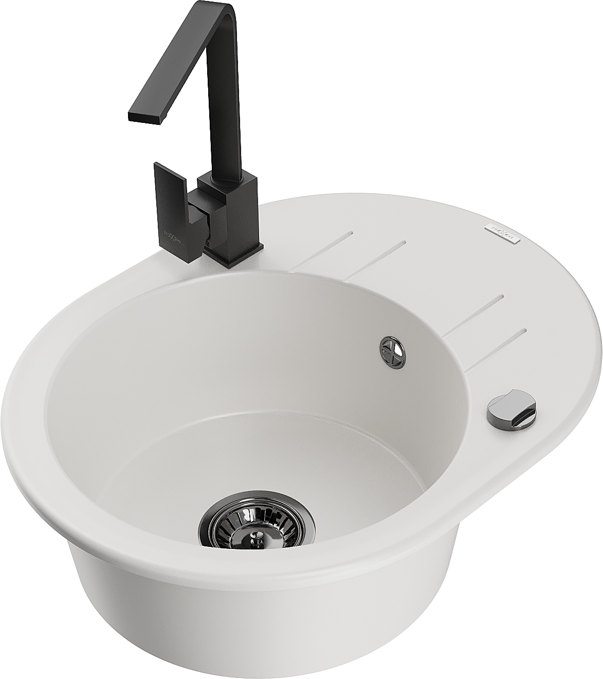 Mexen Kevin zlewozmywak granitowy 1-komorowy z ociekaczem i baterią kuchenną Rita, biały - 6517-20-670300-70