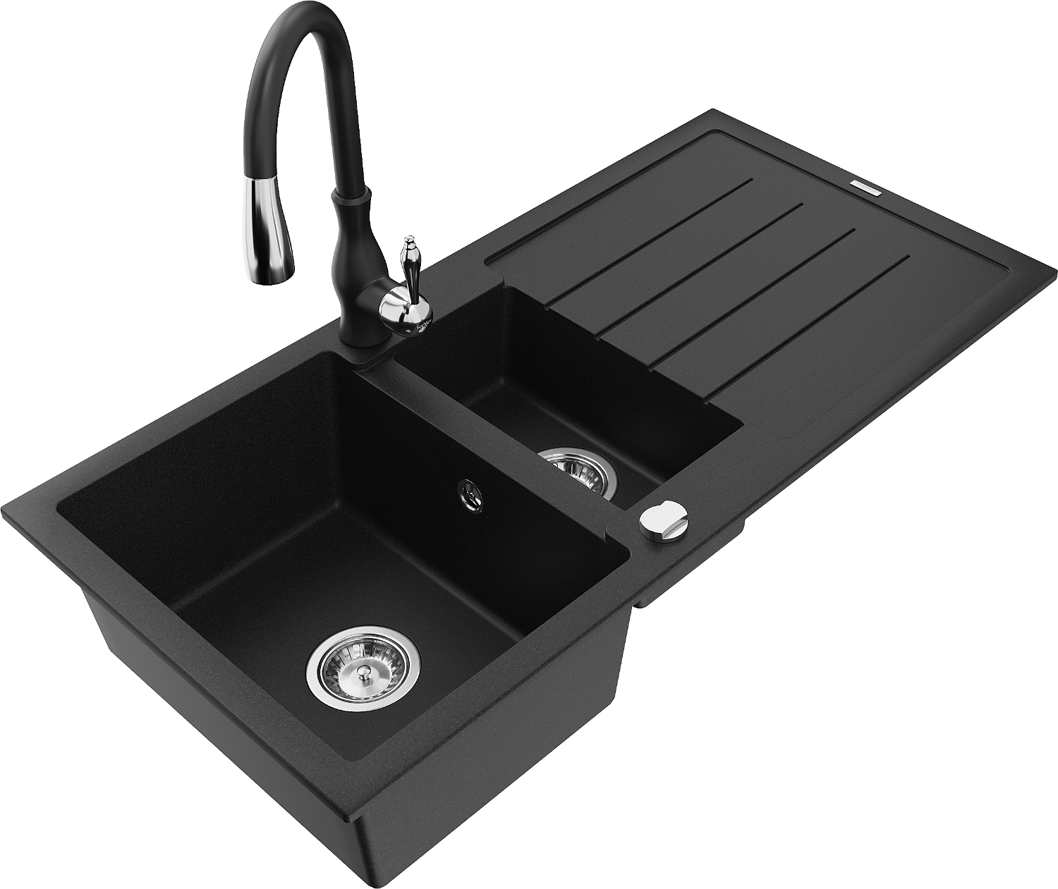 Mexen Andres zlewozmywak granitowy 1,5-komorowy z ociekaczem i baterią kuchenną Savita, czarny - 6515-77-672601-70