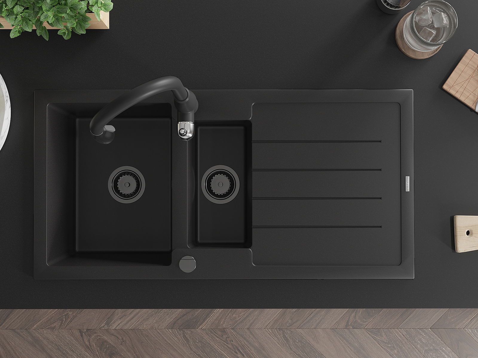 Mexen Andres zlewozmywak granitowy 1,5-komorowy z ociekaczem i baterią kuchenną Savita, czarny - 6515-77-672601-70-B
