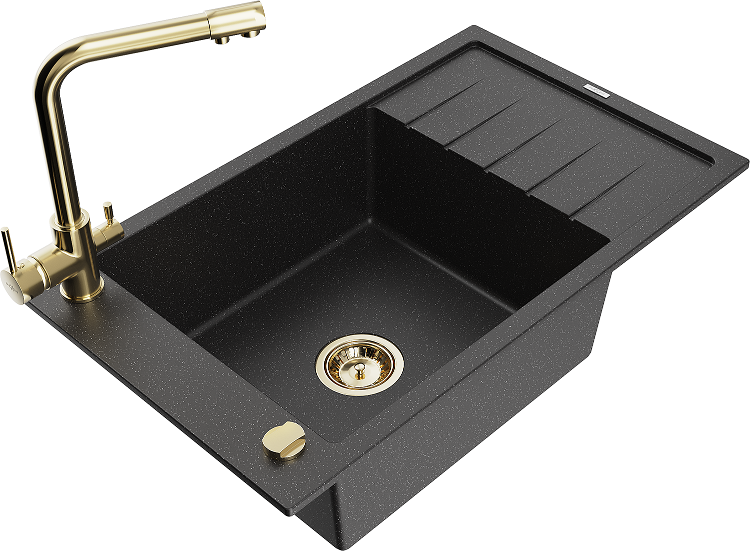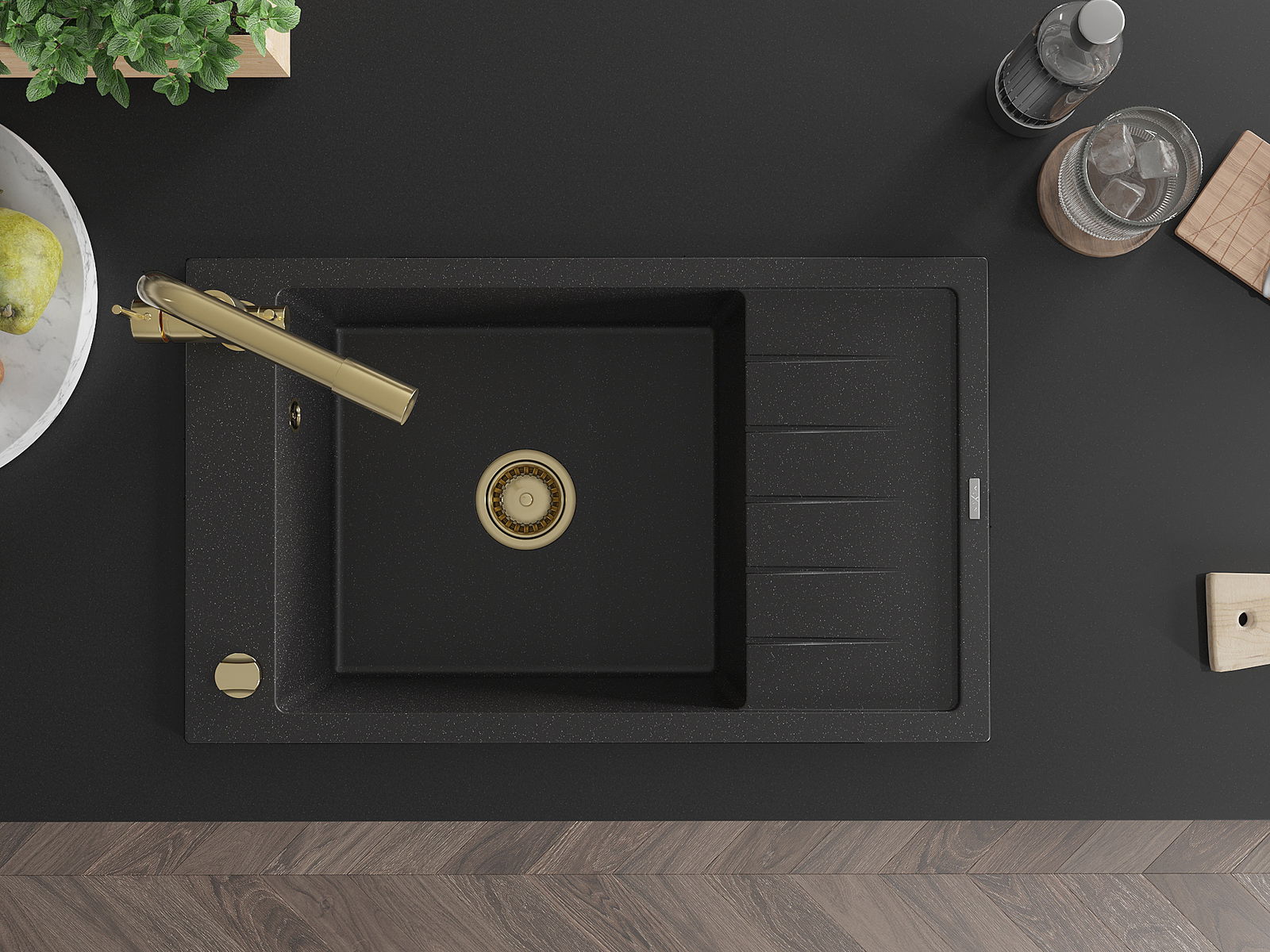 Mexen Elias zlewozmywak granitowy 1-komorowy z ociekaczem i baterią kuchenną Duero, czarny/srebrny metalik - 6511-73-671600-50