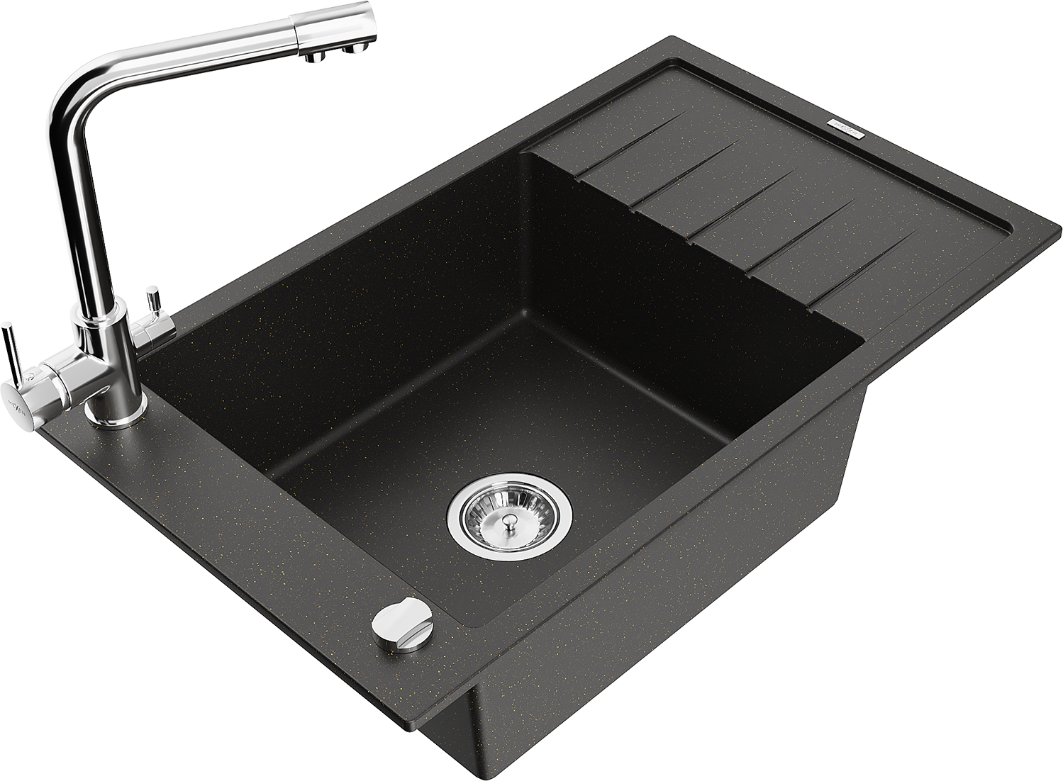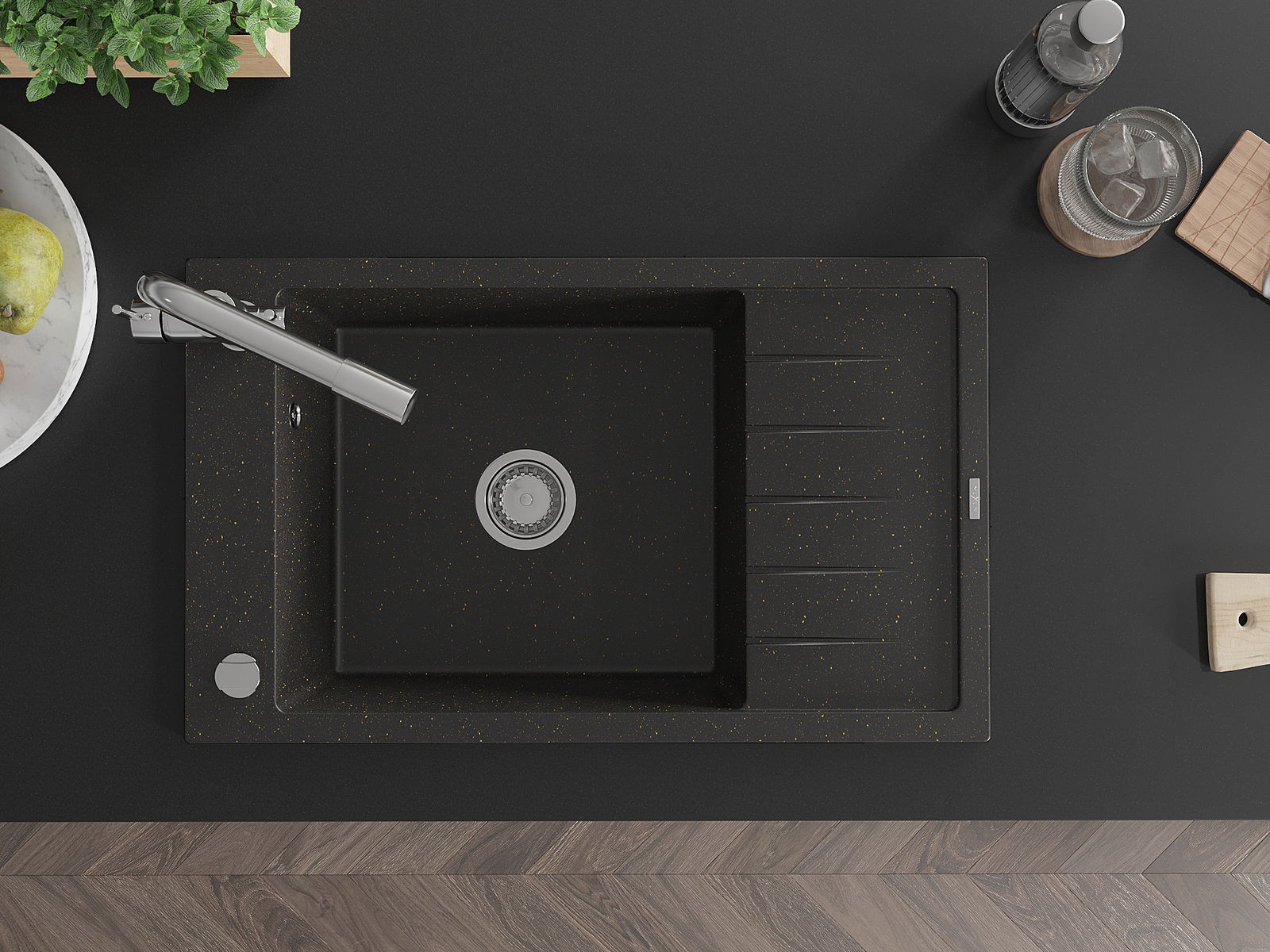 Mexen Elias zlewozmywak granitowy 1-komorowy z ociekaczem i baterią kuchenną Duero, czarny/złoty metalik - 6511-75-671600-00