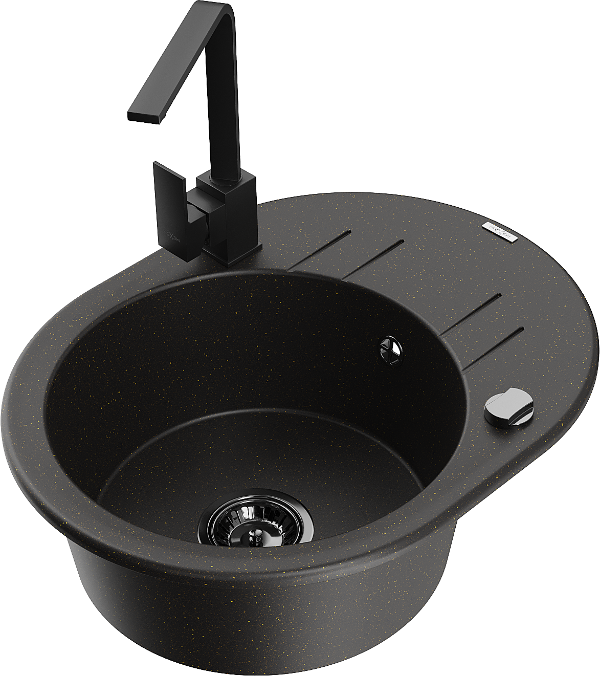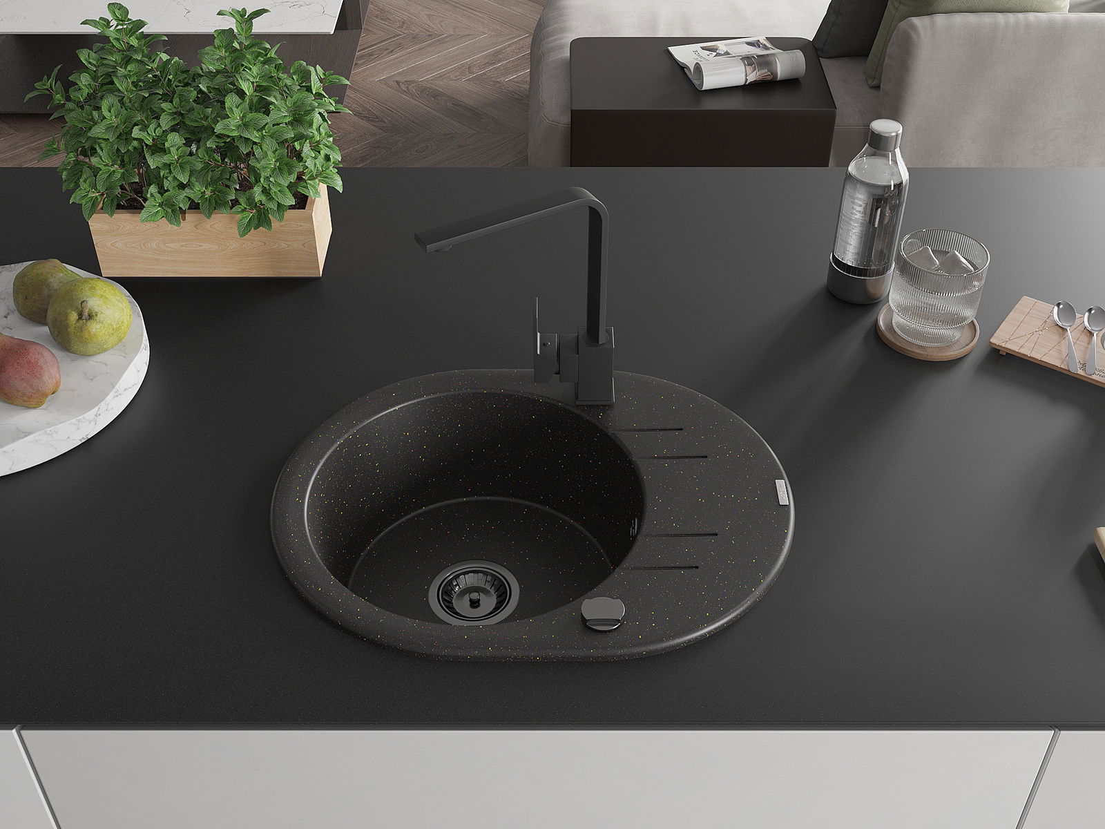 Mexen Kevin zlewozmywak granitowy 1-komorowy z ociekaczem i baterią kuchenną Rita, czarny/złoty metalik - 6517-75-670300-70-B