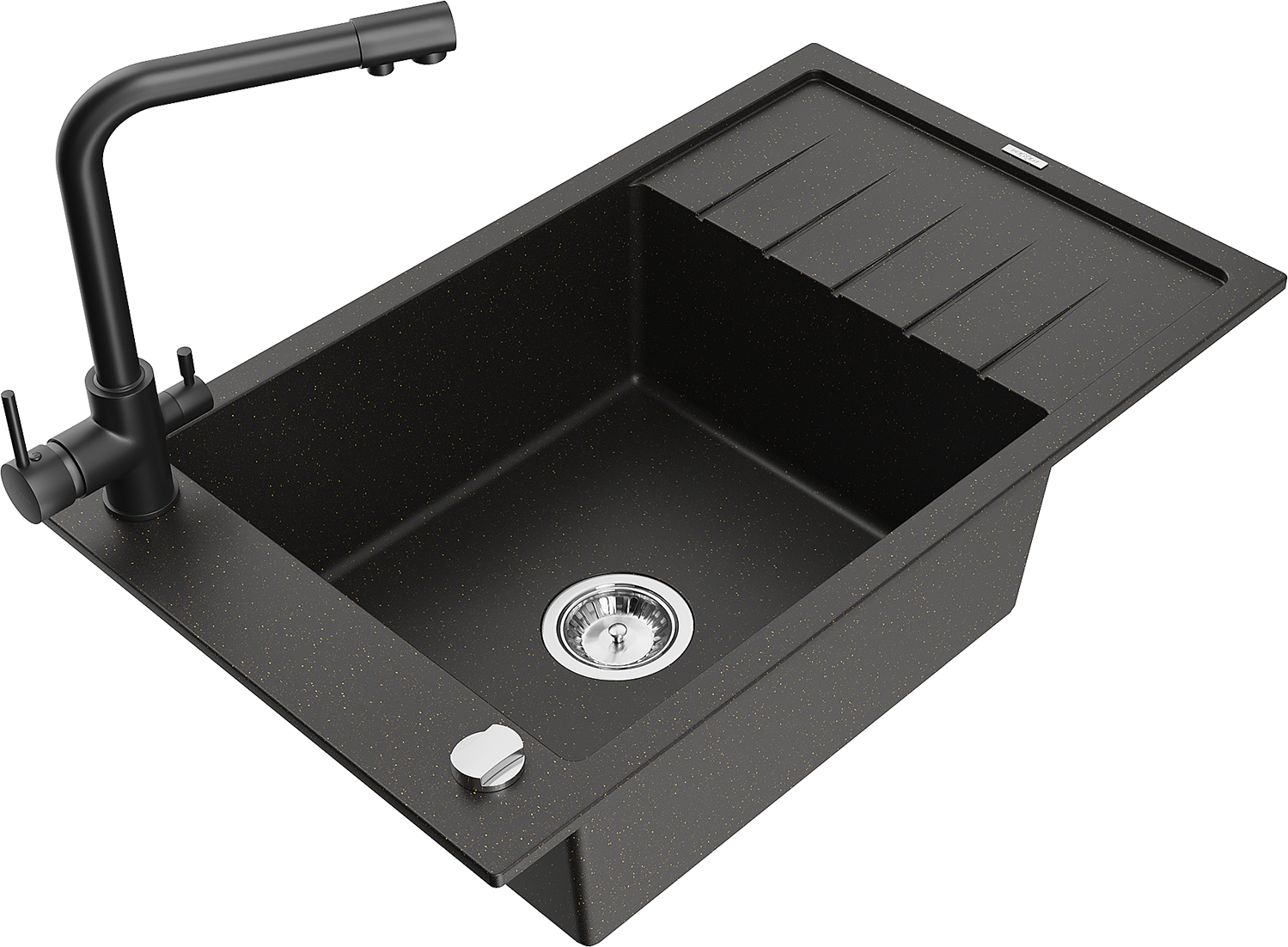 Mexen Elias zlewozmywak granitowy 1-komorowy z ociekaczem i baterią kuchenną Duero, czarny/złoty metalik - 6511-75-671600-70