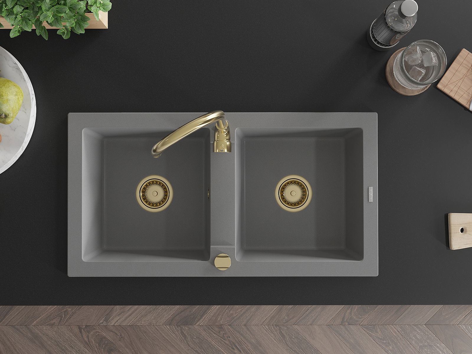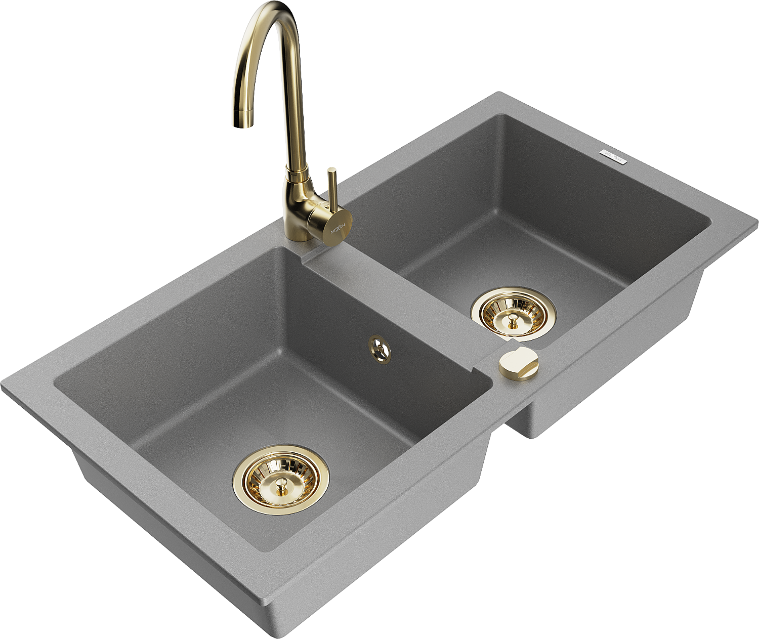 Mexen Mario zlewozmywak granitowy 2-komorowy z baterią kuchenną Telma, szary - 6504-71-670200-50