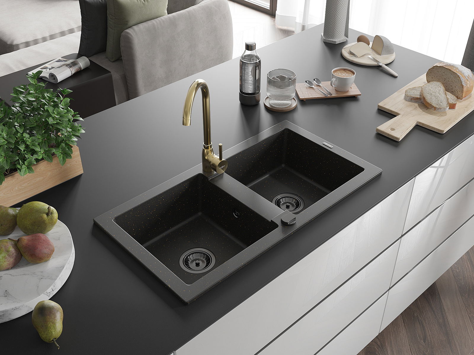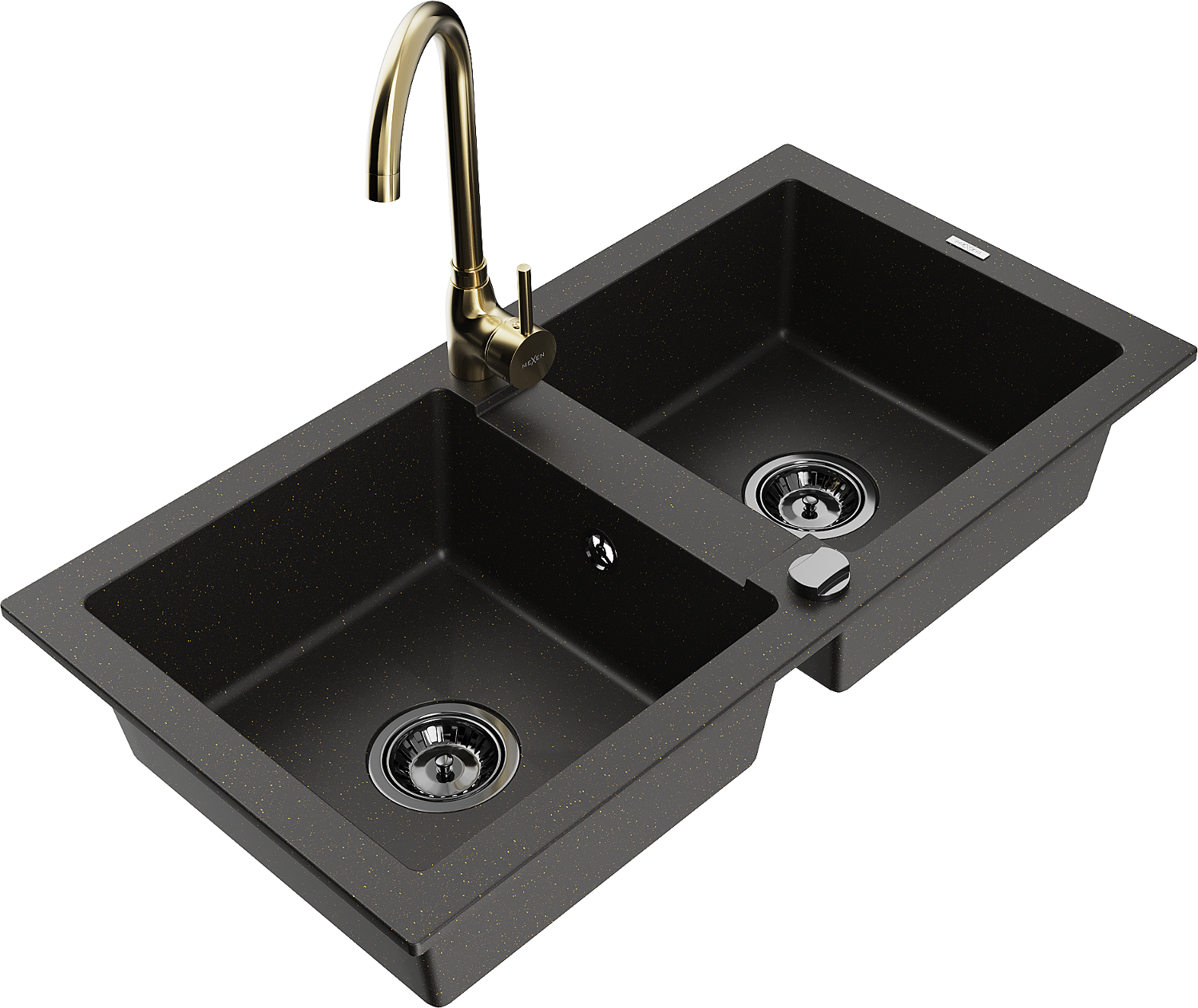 Mexen Mario zlewozmywak granitowy 2-komorowy z baterią kuchenną Telma, czarny/złoty - 6504-75-670200-50-B