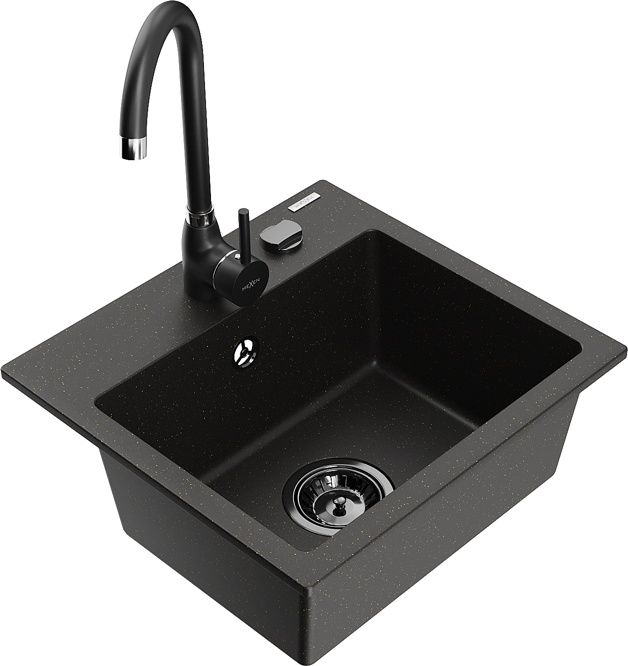 Mexen Milo zlewozmywak granitowy 1-komorowy z baterią kuchenną Telma, czarny/złoty - 6505-75-670200-70-B