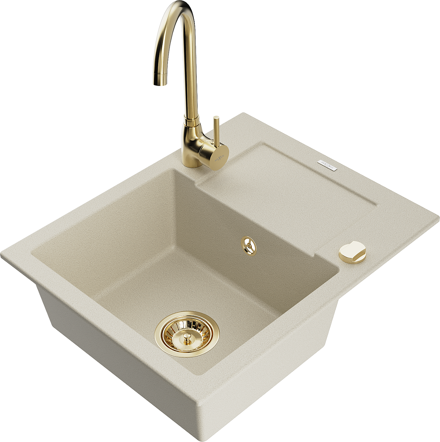 Mexen Enzo zlewozmywak granitowy 1-komorowy z ociekaczem i baterią kuchenną Telma, beżowy - 6506-69-670200-50