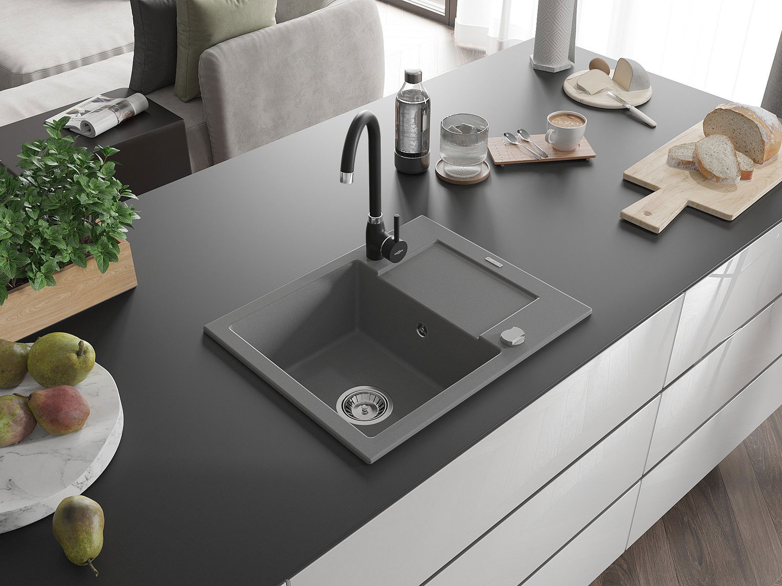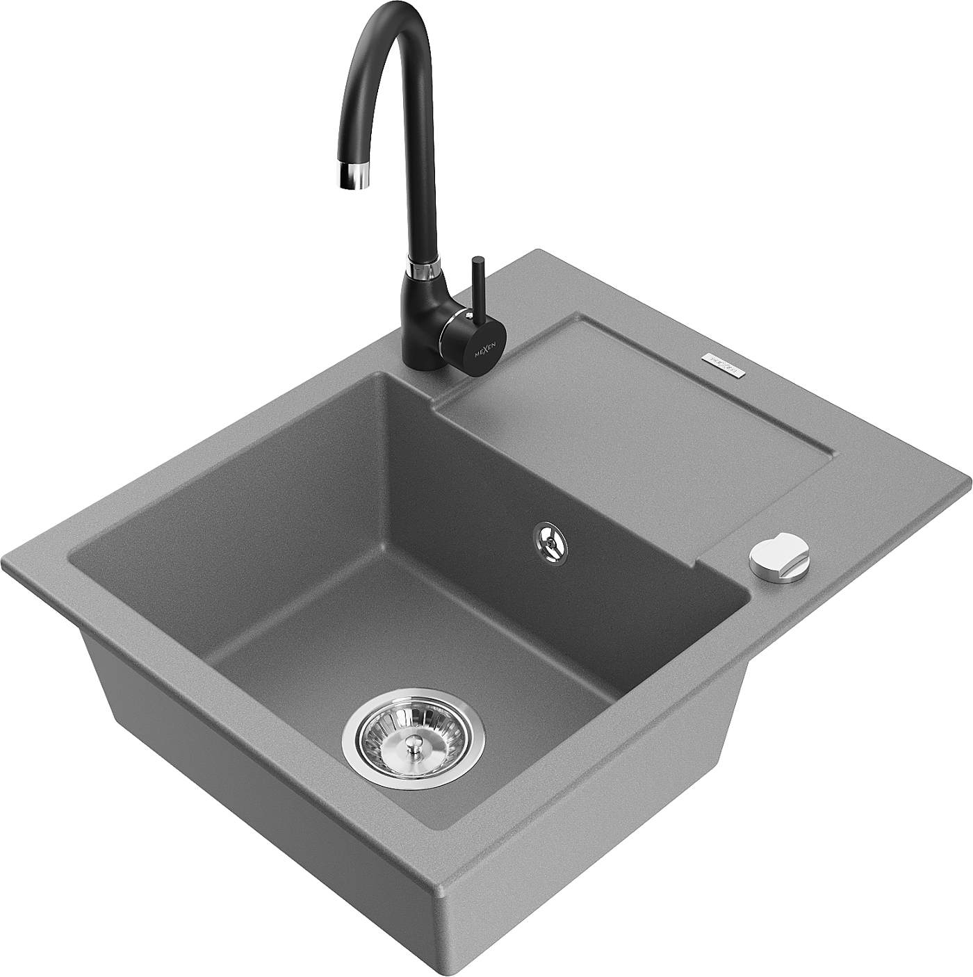 Mexen Enzo zlewozmywak granitowy 1-komorowy z ociekaczem i baterią kuchenną Telma, szary - 6506-71-670200-70