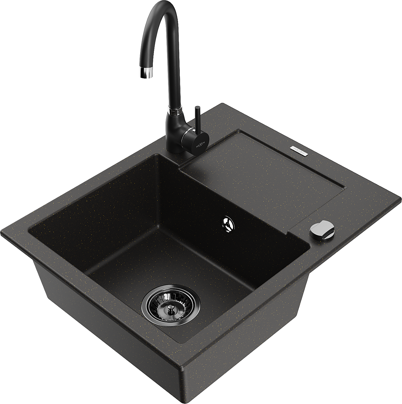 Mexen Enzo zlewozmywak granitowy 1-komorowy z ociekaczem i baterią kuchenną Telma, czarny/złoty - 6506-75-670200-70-B