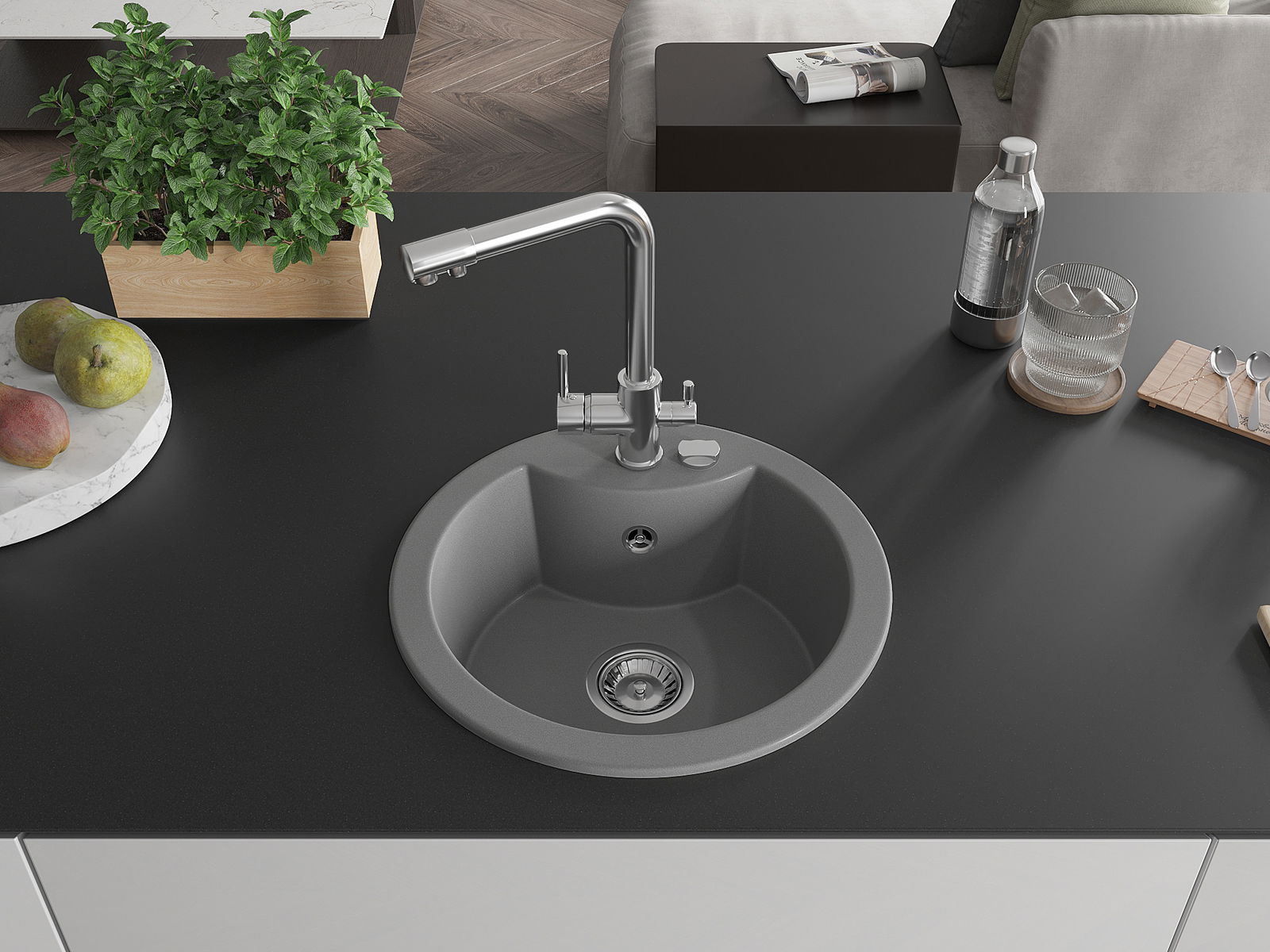 Zlew posiada podfrezowany otwór o średnicy 35 mm do samodzielnego wybicia. Można go wykorzystać m.in. do montażu dozownika na płyn, który wyeliminuje obecność plastikowych butelek w kuchni i nada jej eleganckiego wykończenia.