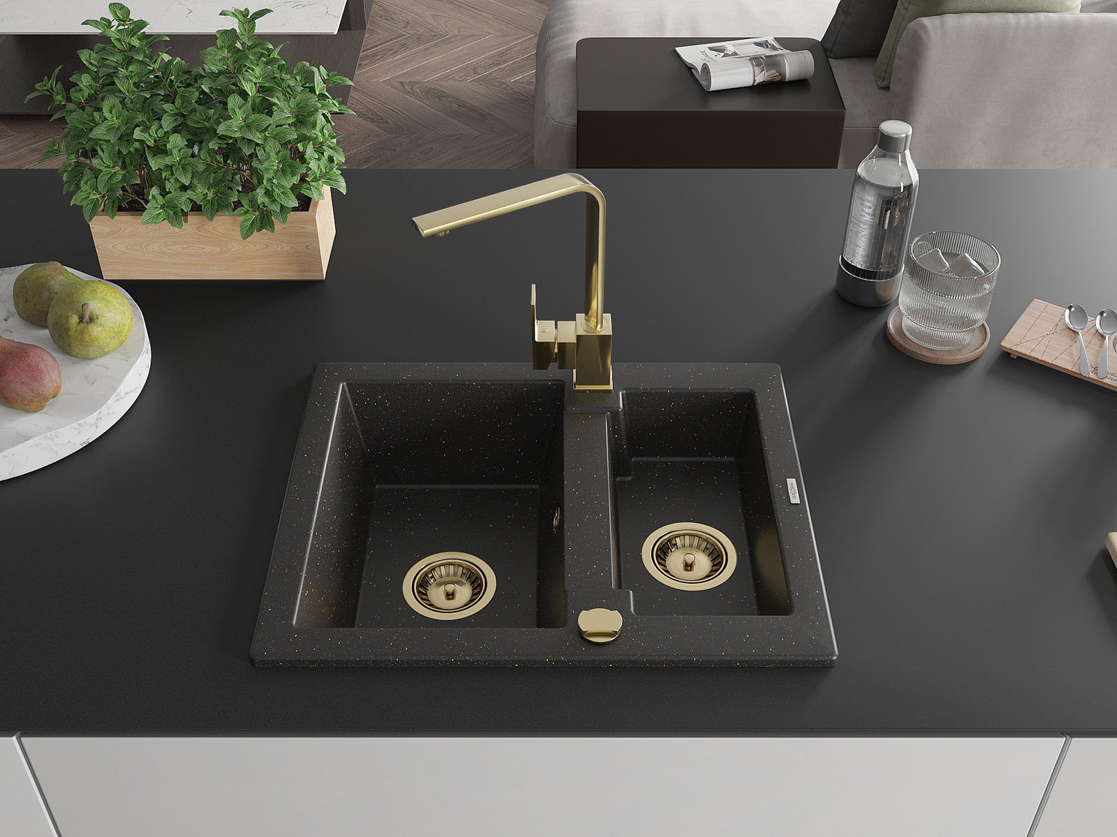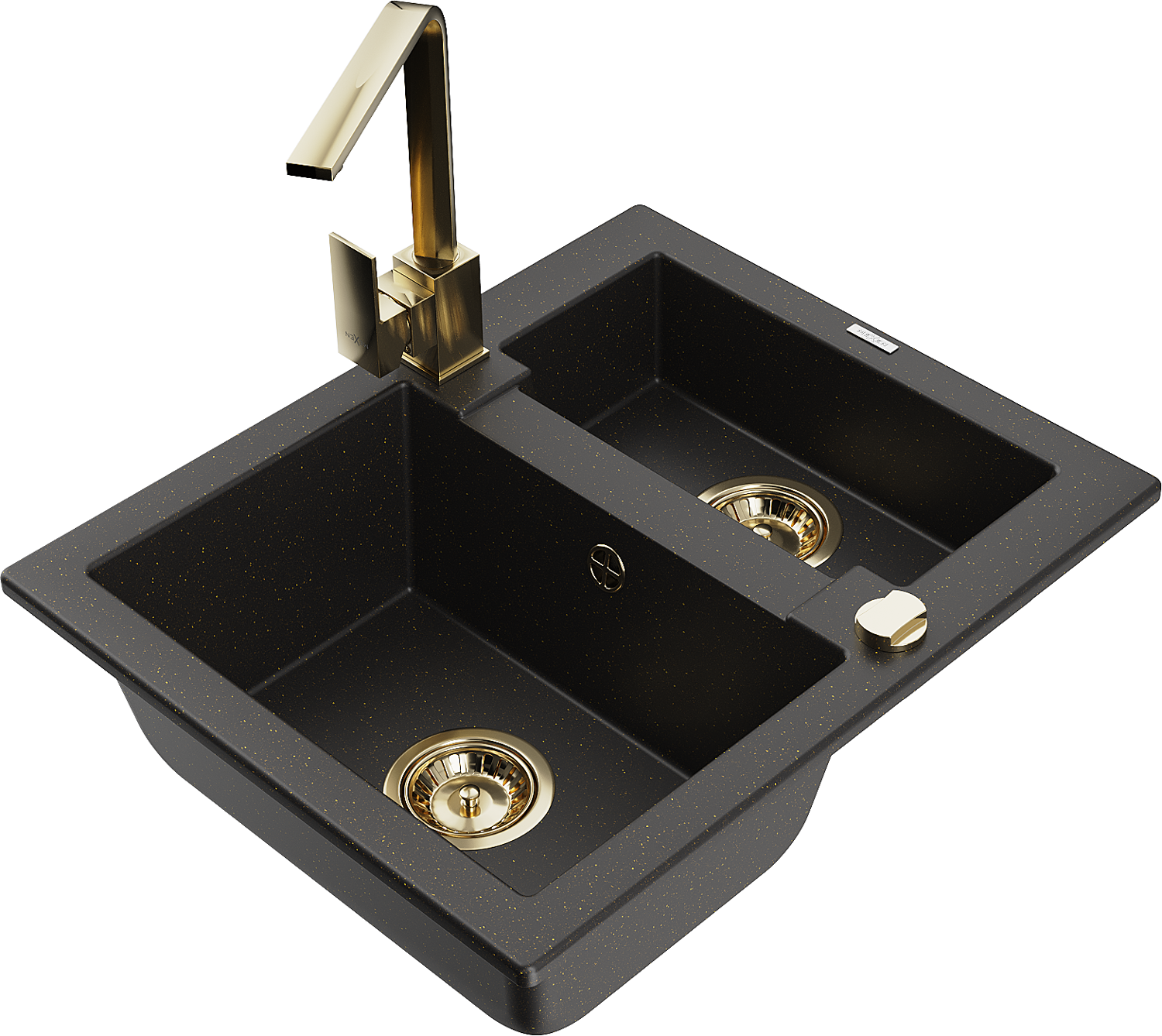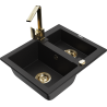 Mexen Carlos zlewozmywak granitowy 1,5-komorowy z baterią kuchenną Rita, czarny/złoty metalik - 6518-75-670300-50
