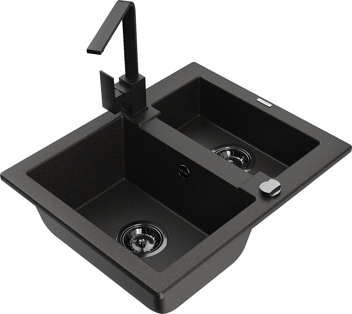 Mexen Carlos zlewozmywak granitowy 1,5-komorowy z baterią kuchenną Rita, czarny/złoty metalik - 6518-75-670300-70-B