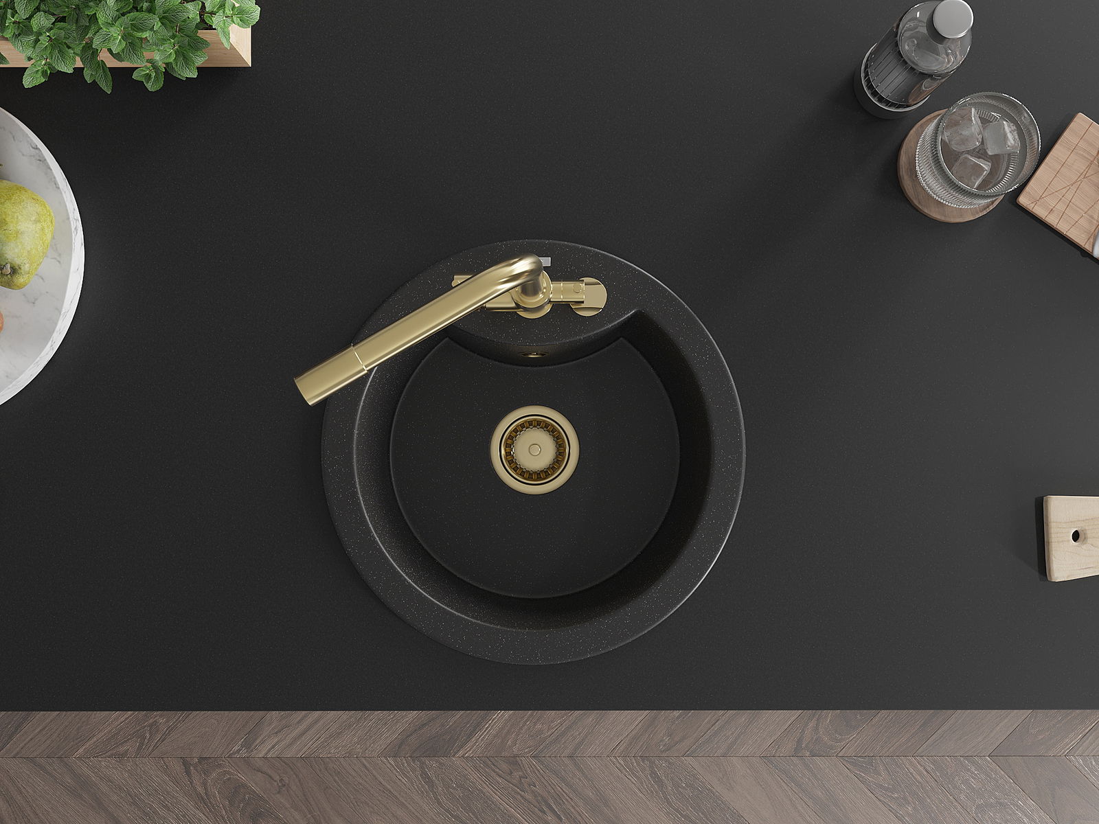 Zlew posiada podfrezowany otwór o średnicy 35 mm do samodzielnego wybicia. Można go wykorzystać m.in. do montażu dozownika na płyn, który wyeliminuje obecność plastikowych butelek w kuchni i nada jej eleganckiego wykończenia.