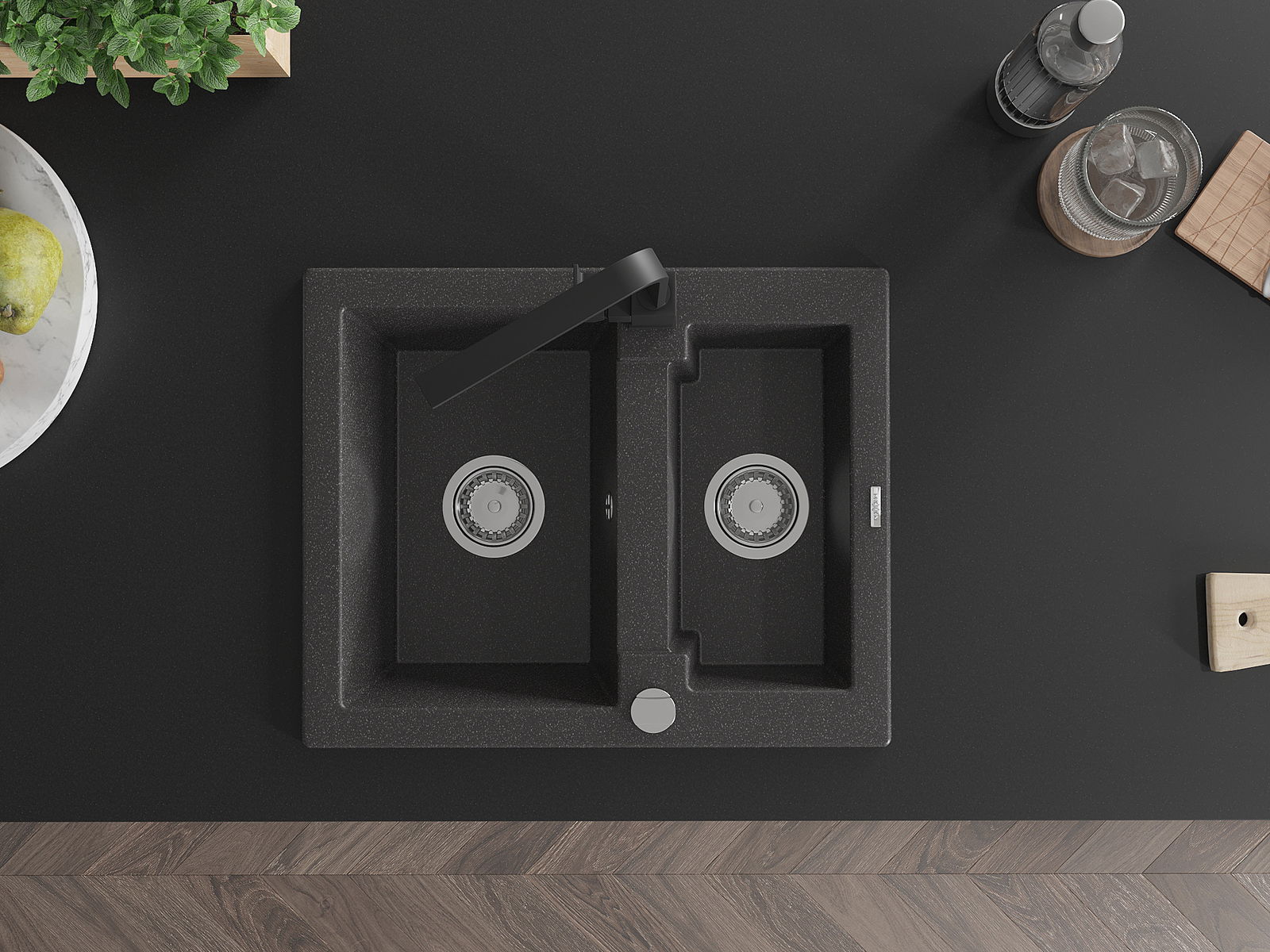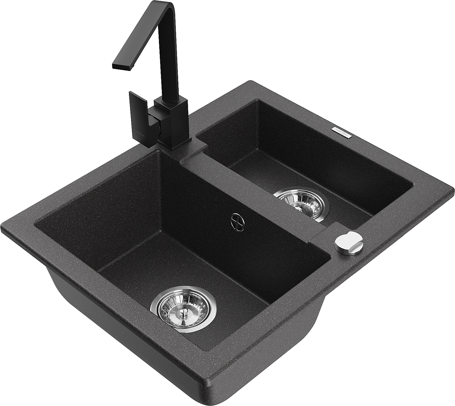 Mexen Carlos zlewozmywak granitowy 1,5-komorowy z baterią kuchenną Rita, czarny nakrapiany - 6518-76-670300-70
