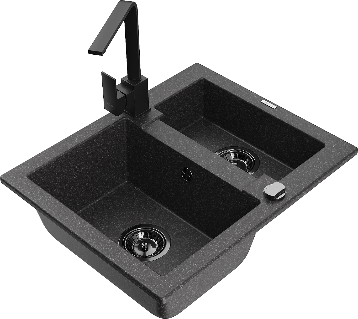 Mexen Carlos zlewozmywak granitowy 1,5-komorowy z baterią kuchenną Rita, czarny nakrapiany - 6518-76-670300-70-B