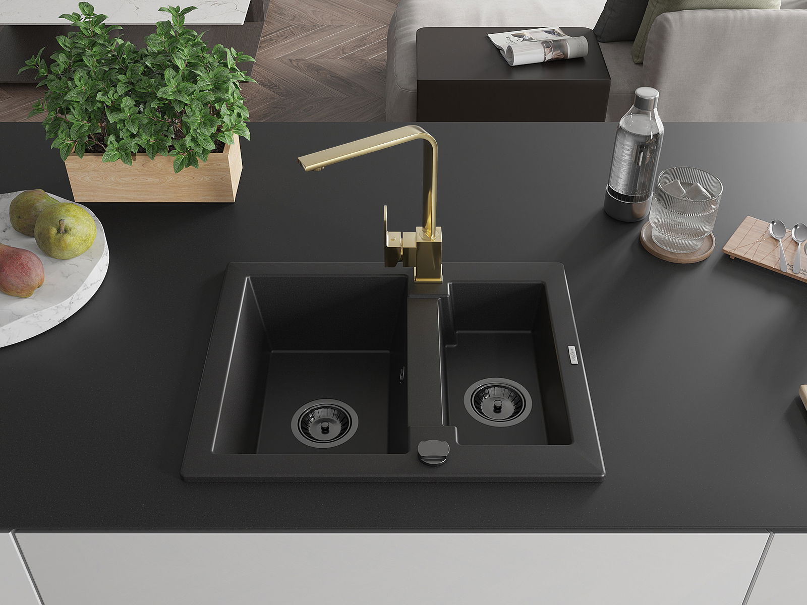 Mexen Carlos zlewozmywak granitowy 1,5-komorowy z baterią kuchenną Rita, czarny - 6518-77-670300-70-B