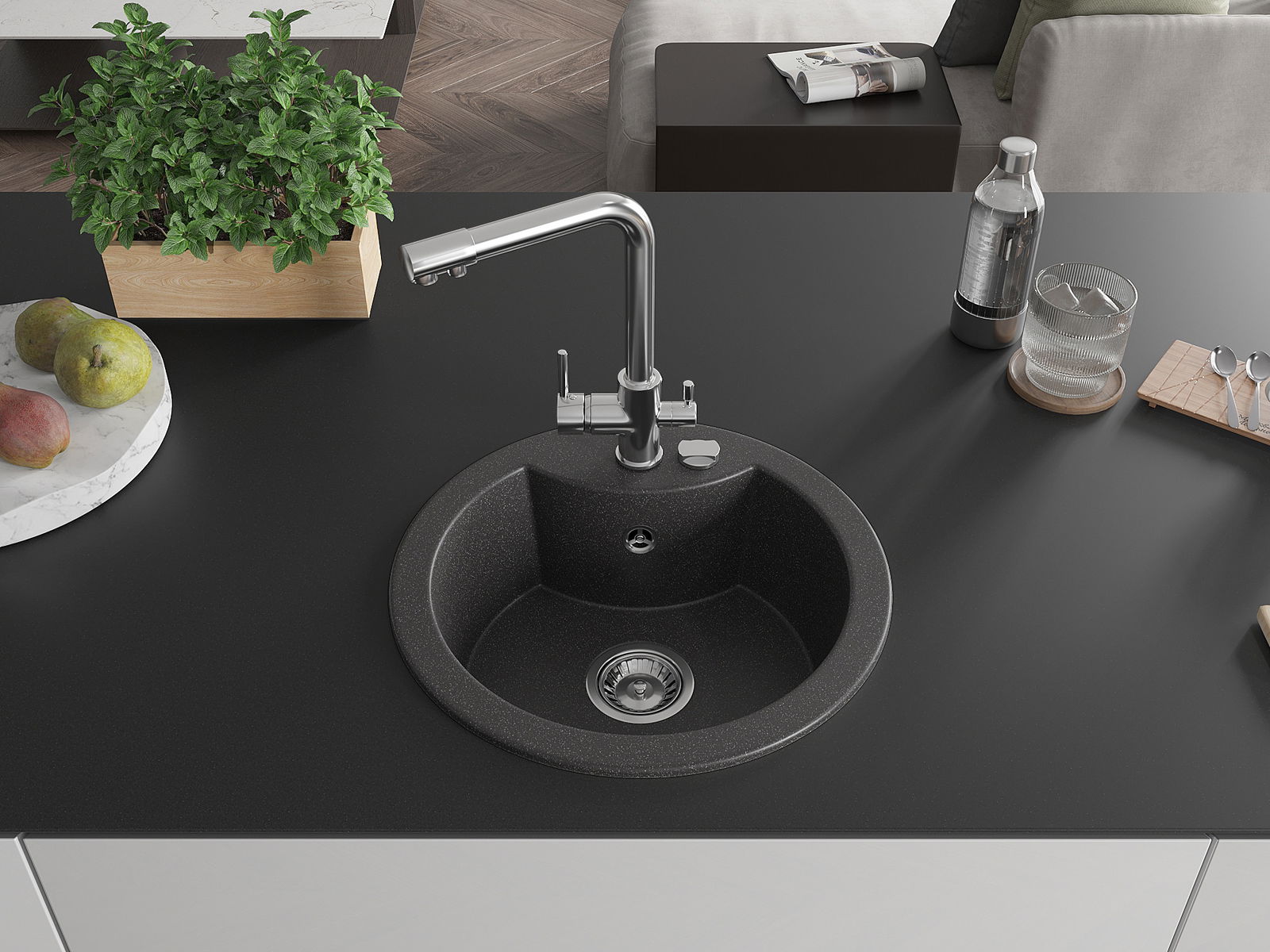 Zlew posiada podfrezowany otwór o średnicy 35 mm do samodzielnego wybicia. Można go wykorzystać m.in. do montażu dozownika na płyn, który wyeliminuje obecność plastikowych butelek w kuchni i nada jej eleganckiego wykończenia.