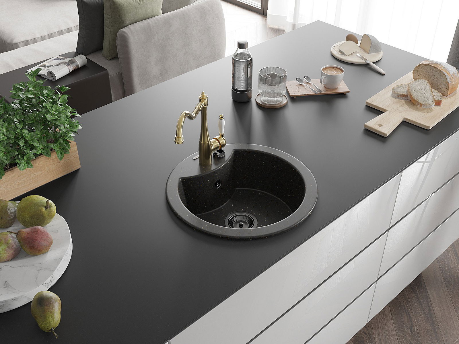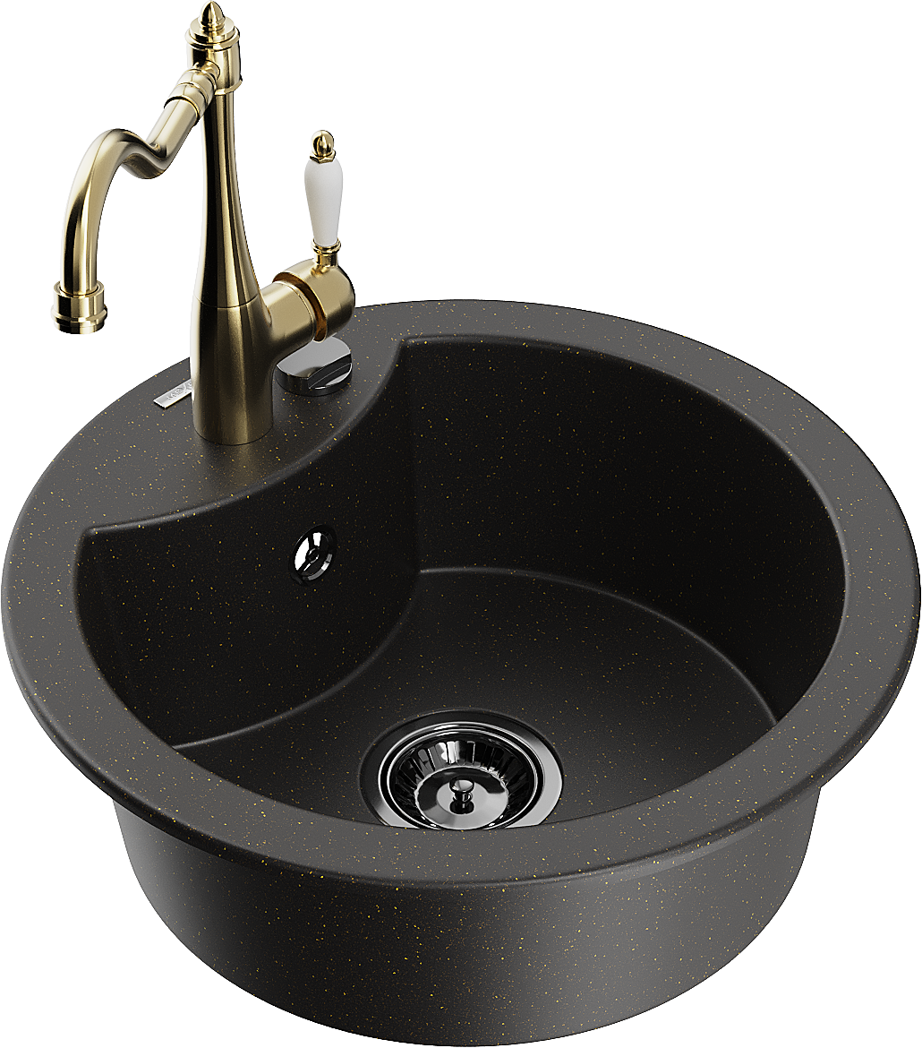 Mexen Diego zlewozmywak granitowy 1-komorowy z baterią kuchenną Carla, czarny/złoty metalik - 6512-75-670700-50-B