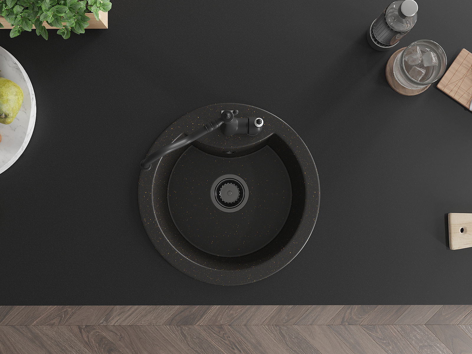 Zlew posiada podfrezowany otwór o średnicy 35 mm do samodzielnego wybicia. Można go wykorzystać m.in. do montażu dozownika na płyn, który wyeliminuje obecność plastikowych butelek w kuchni i nada jej eleganckiego wykończenia.
