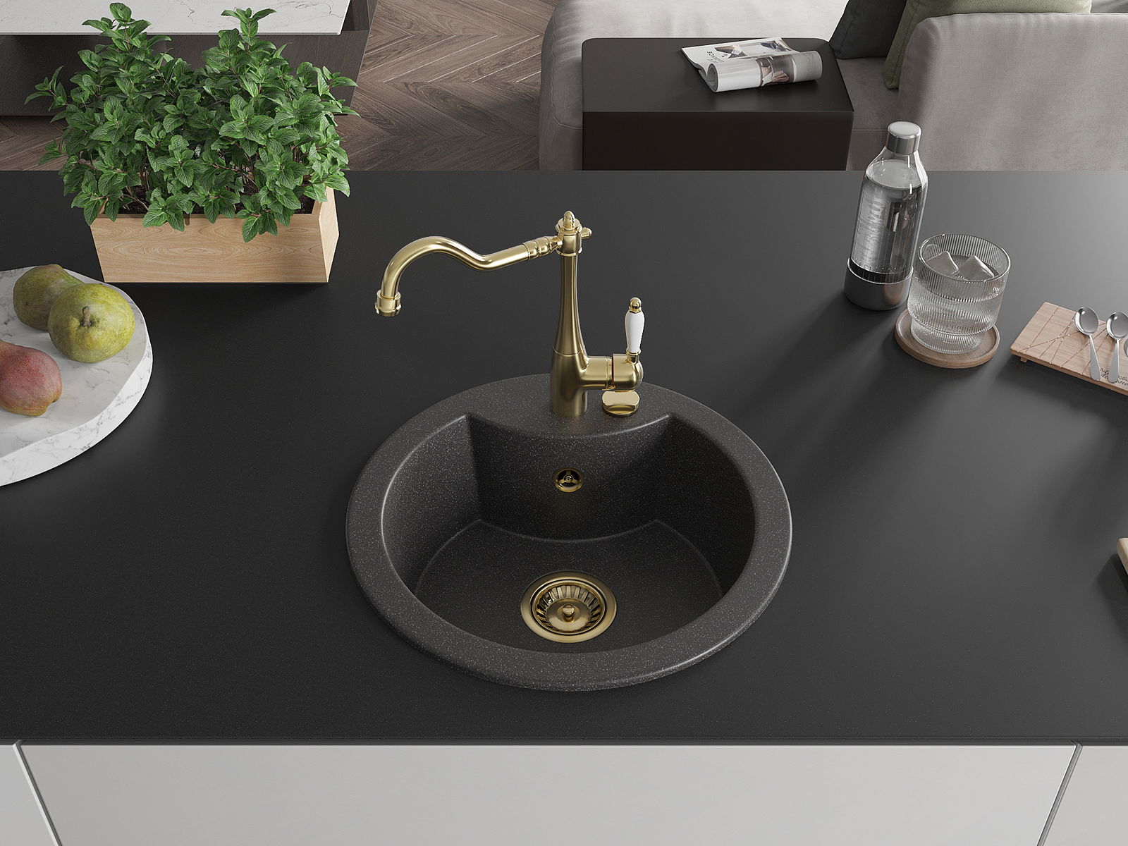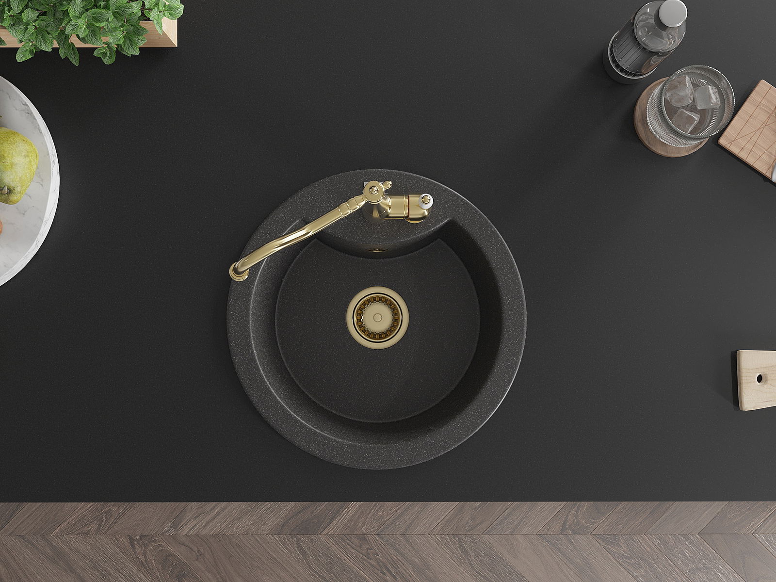 Zlew posiada podfrezowany otwór o średnicy 35 mm do samodzielnego wybicia. Można go wykorzystać m.in. do montażu dozownika na płyn, który wyeliminuje obecność plastikowych butelek w kuchni i nada jej eleganckiego wykończenia.