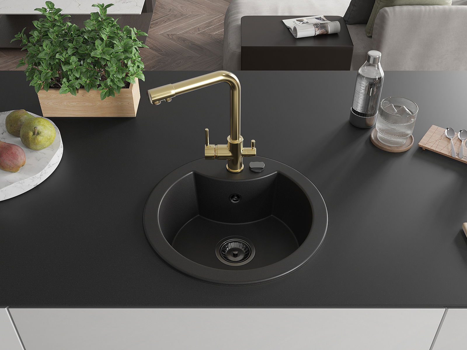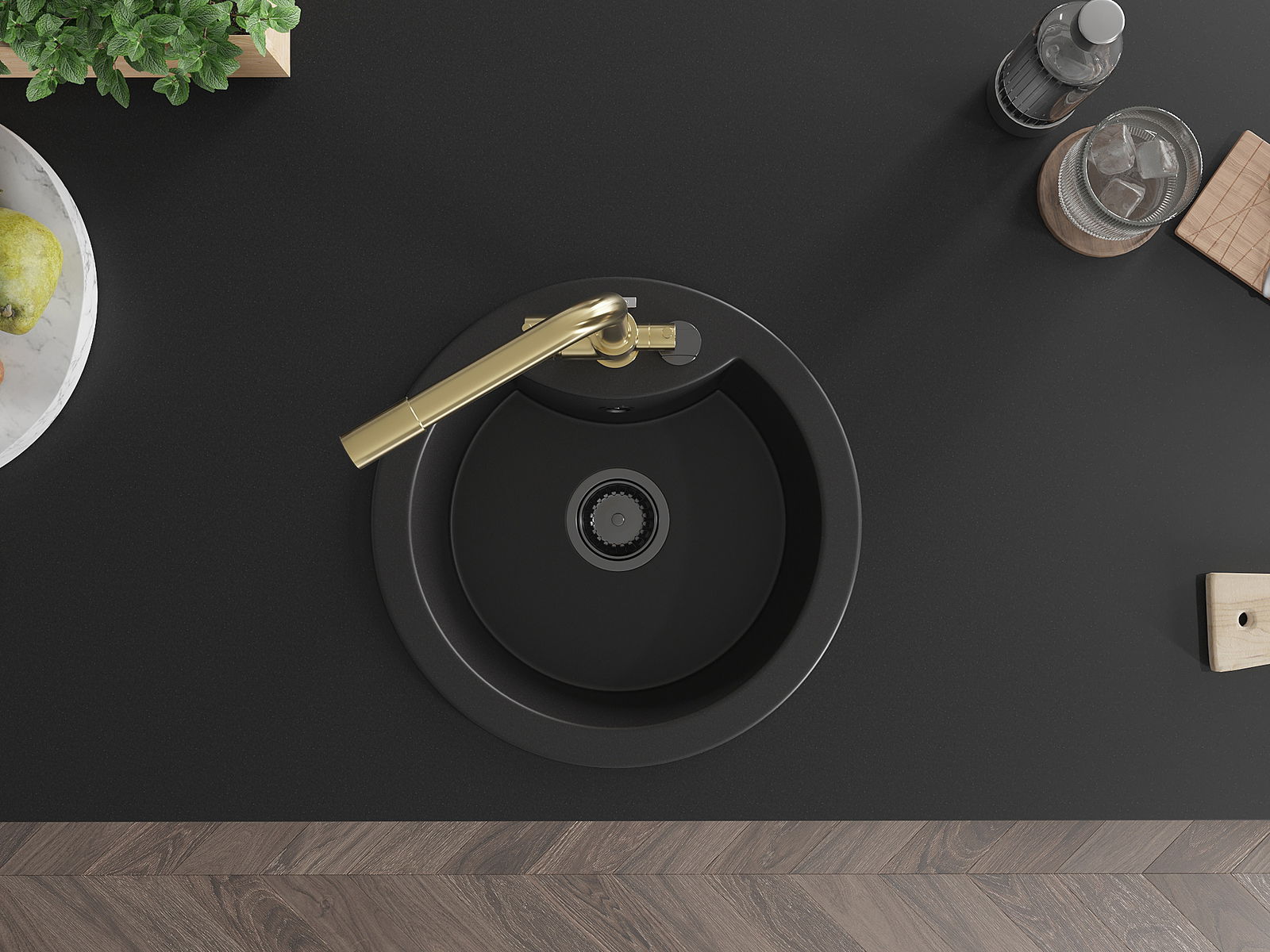 Zlew posiada podfrezowany otwór o średnicy 35 mm do samodzielnego wybicia. Można go wykorzystać m.in. do montażu dozownika na płyn, który wyeliminuje obecność plastikowych butelek w kuchni i nada jej eleganckiego wykończenia.
