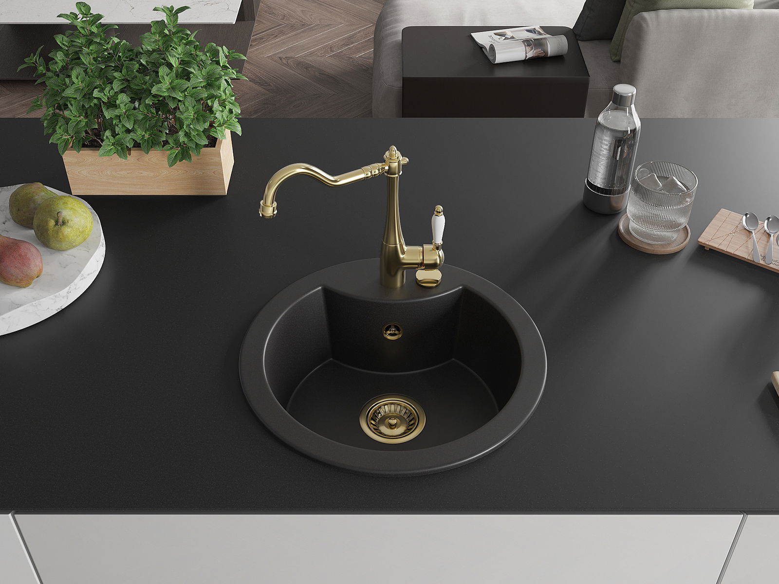 Zlew posiada podfrezowany otwór o średnicy 35 mm do samodzielnego wybicia. Można go wykorzystać m.in. do montażu dozownika na płyn, który wyeliminuje obecność plastikowych butelek w kuchni i nada jej eleganckiego wykończenia.