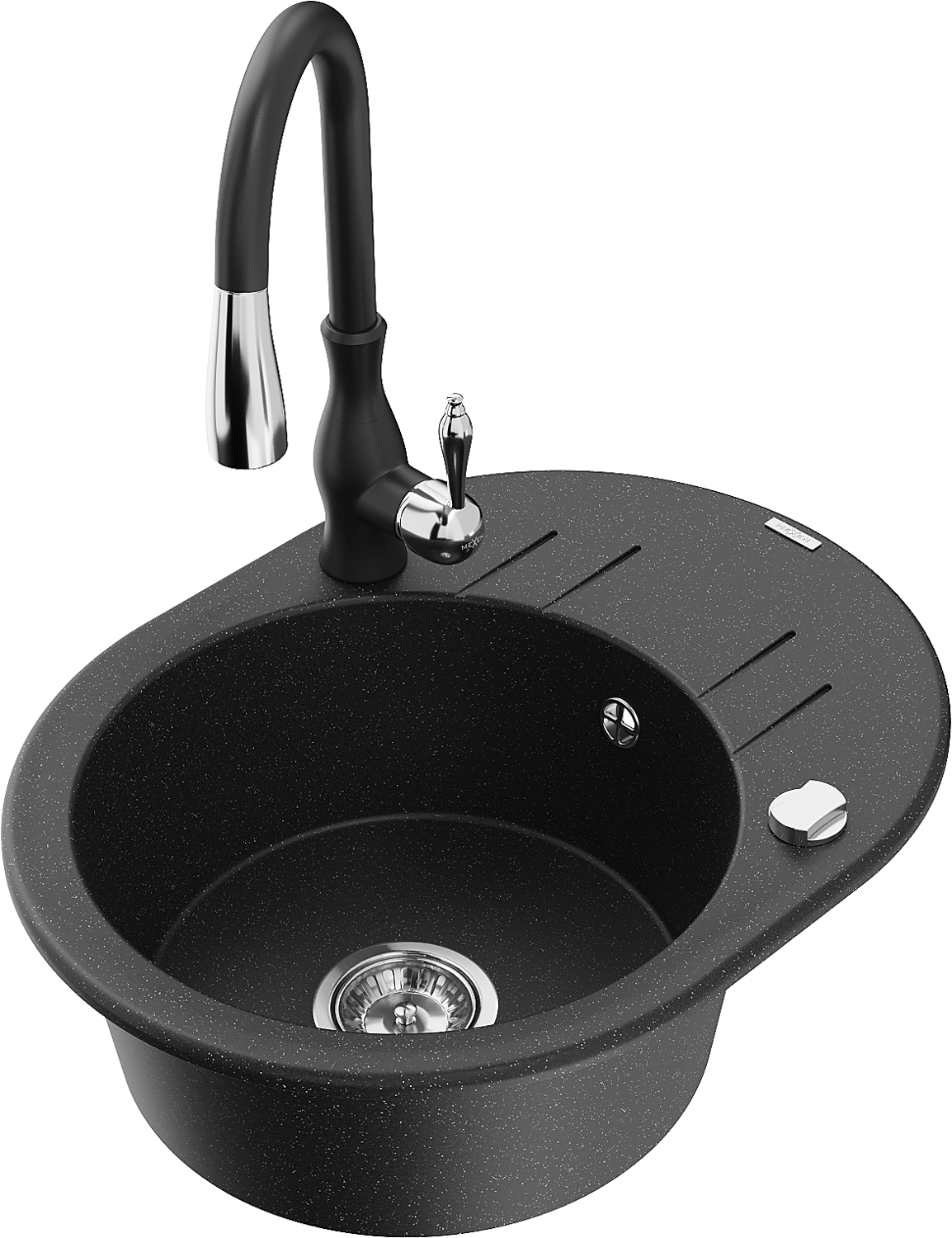 Mexen Kevin zlewozmywak granitowy 1-komorowy z ociekaczem i baterią kuchenną Savita, czarny/srebrny metalik - 6517-73-672601-70