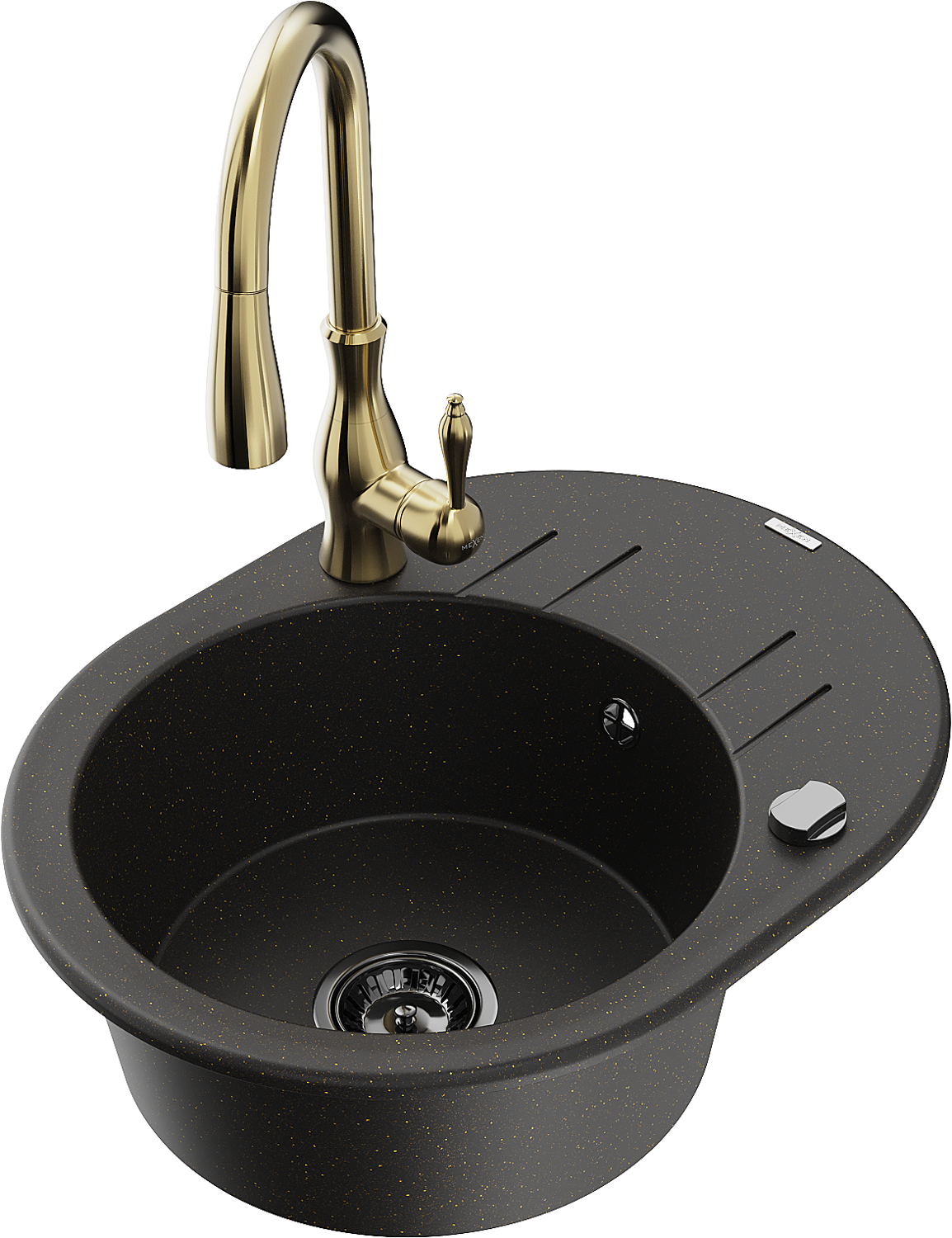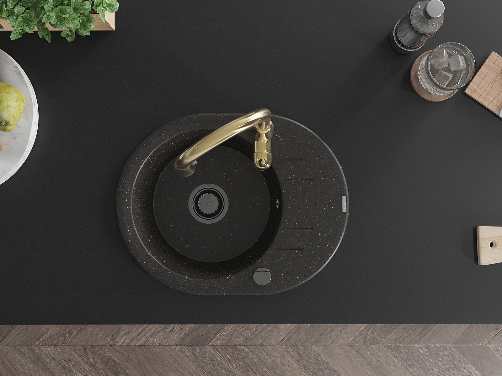 Mexen Kevin zlewozmywak granitowy 1-komorowy z ociekaczem i baterią kuchenną Savita, czarny/złoty metalik - 6517-75-672601-50-B