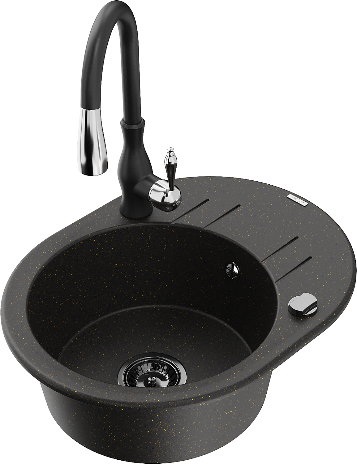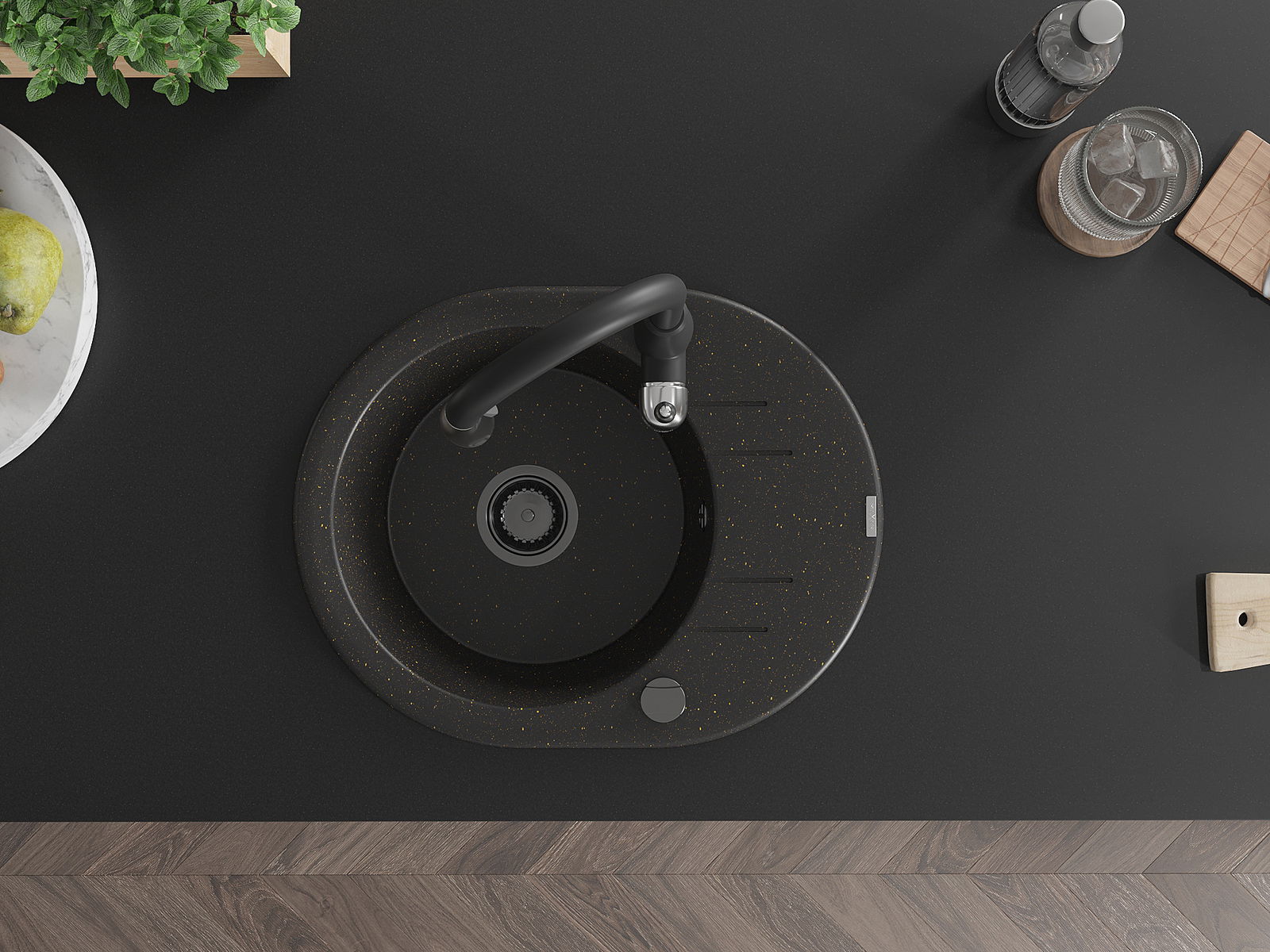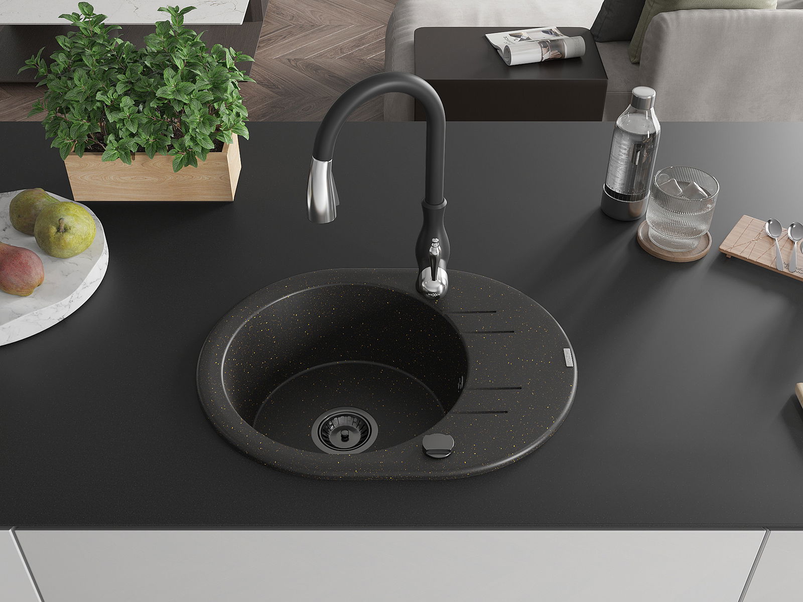 Mexen Kevin zlewozmywak granitowy 1-komorowy z ociekaczem i baterią kuchenną Savita, czarny/złoty metalik - 6517-75-672601-70-B