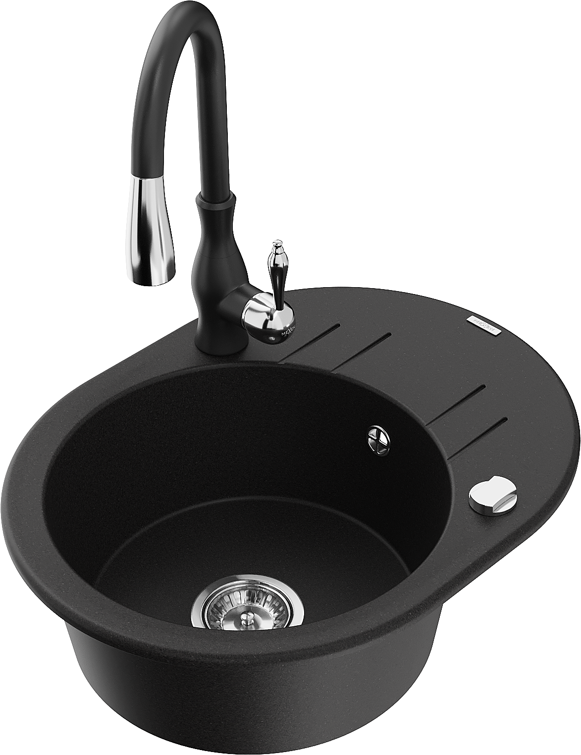 Mexen Kevin zlewozmywak granitowy 1-komorowy z ociekaczem i baterią kuchenną Savita, czarny - 6517-77-672601-70