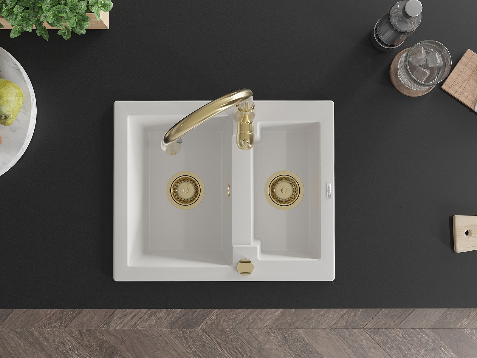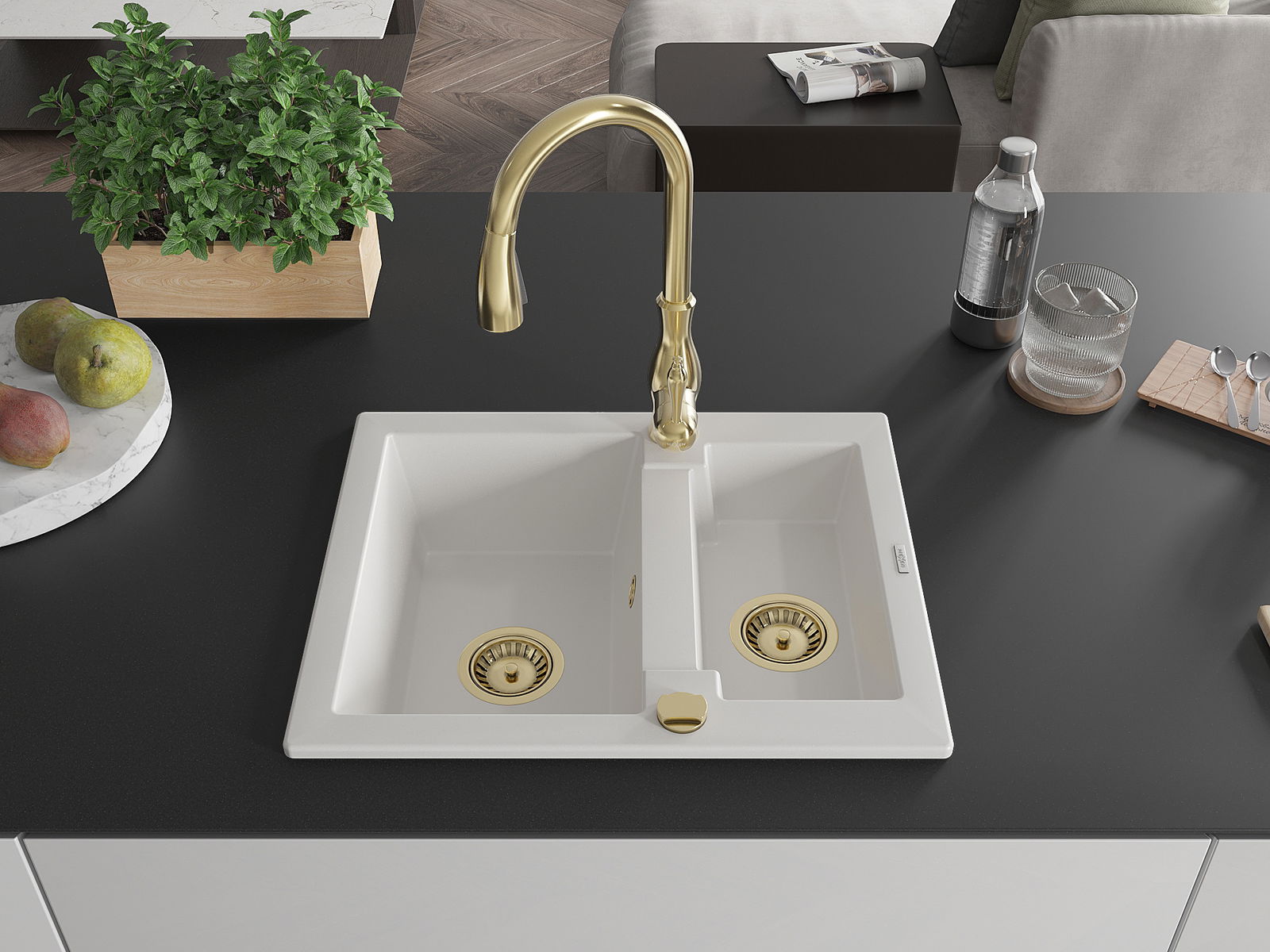 Mexen Carlos zlewozmywak granitowy 1,5-komorowy z baterią kuchenną Savita, biały - 6518-20-672601-50