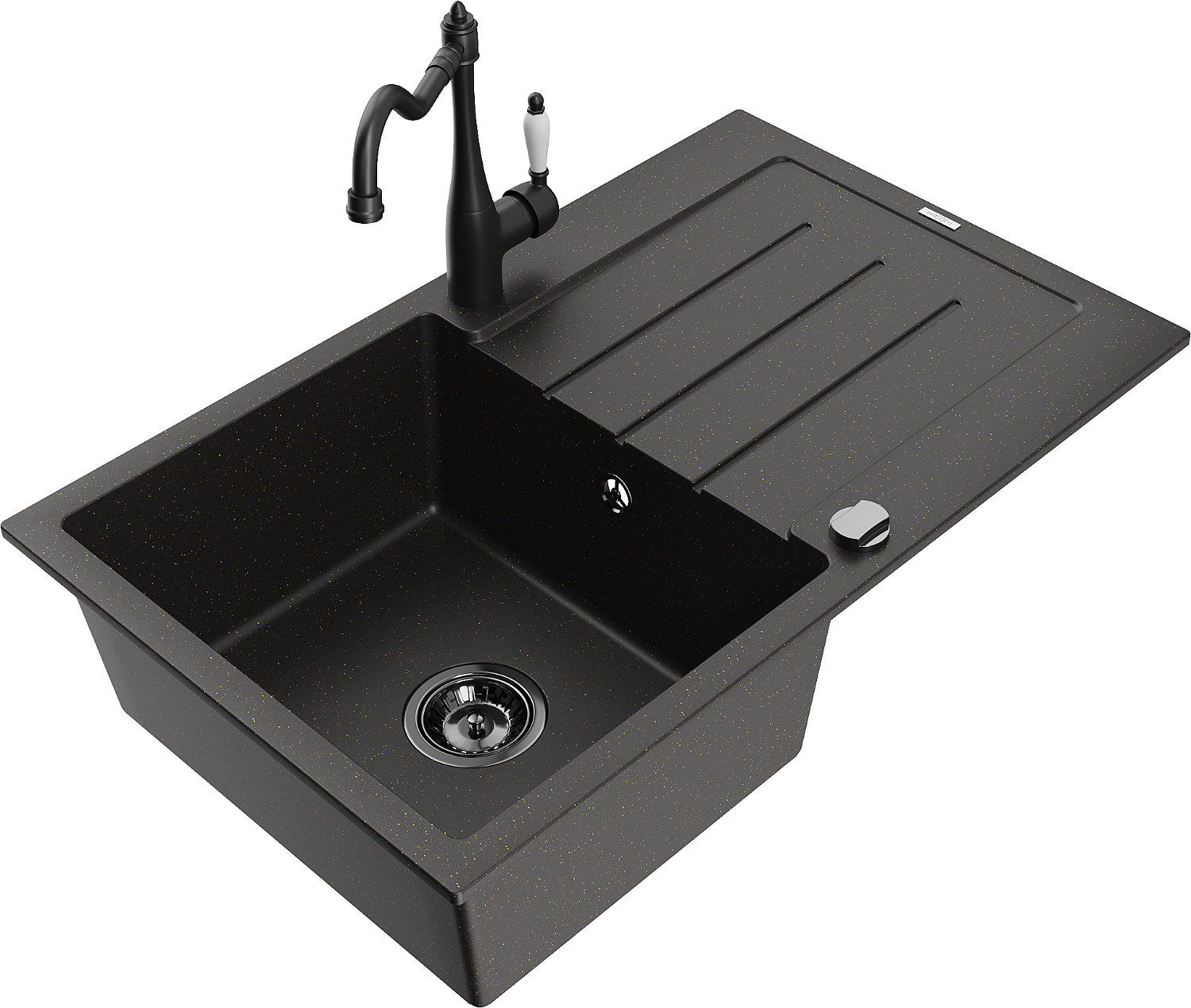 Mexen Bruno zlewozmywak granitowy 1-komorowy z ociekaczem i baterią kuchenną Carla, czarny/złoty metalik - 6513-75-670700-70-B