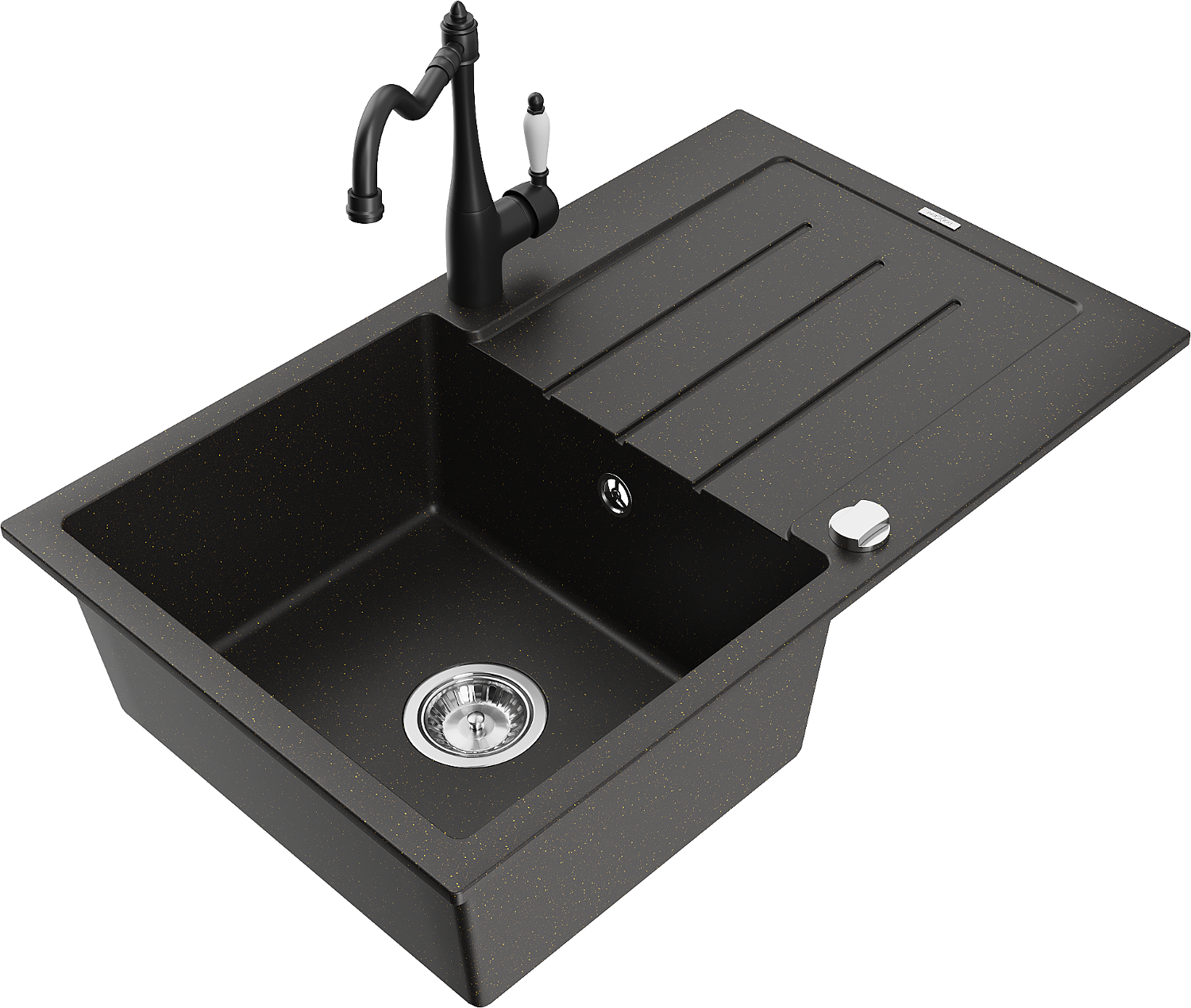 Mexen Bruno zlewozmywak granitowy 1-komorowy z ociekaczem i baterią kuchenną Carla, czarny/złoty metalik - 6513-75-670700-70